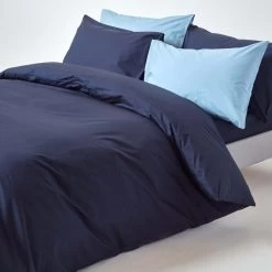 Available in single, double, king size and super king size, all of our navy blue duvet covers come with matching housewife pillow cases (one pillowcase with single sizes). *This fabric has been commissioned by using single ply finely combed pure cotton yarns to provide a higher density fresh and crisp percale. These single ply yarns, even though have 200 threads per square inch of weaving, the resultant fabric is far superior than most multiply yarn fabrics with an alleged 400 thread count. Our striking duvet and pillow cover set is hypoallergenic and anti-dust mite due to the dense cotton weave.
