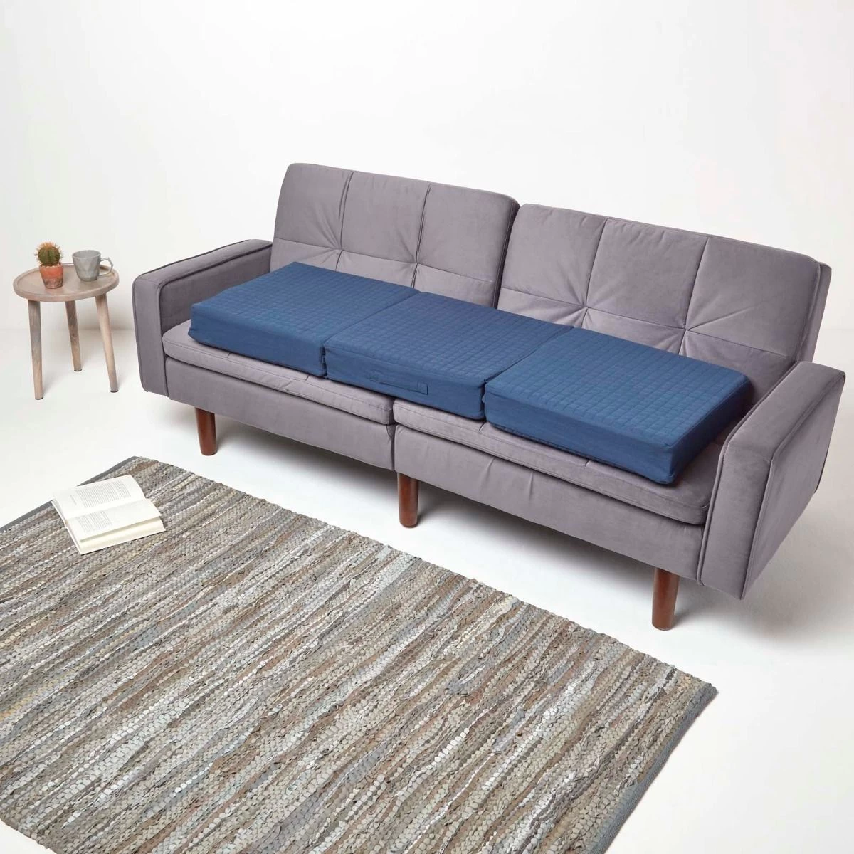 Navy blue cotton 3 seater booster cushion with removable quilted cover, large 150 cm wide firm and supportive sofa seat cushion for the elderly and pregnant women.