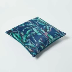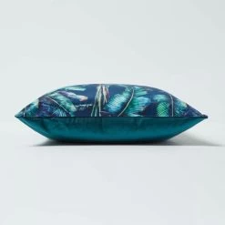 Banana Leaf Velvet Cushion by Homescapes. With a soft finish and a reversible design, this navy velvet cushion is ideal for adding a tropical touch to your home.