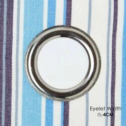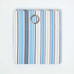 These fashionable New England Stripes Eyelet Curtains are ideal for adding a cool contemporary look to any room, and the various shades of blue used in these curtains complement each other perfectly. These stylish New England Stripes Curtains are one pair in Homescapes impressive range of pure cotton designer curtains in many charming designs and soft prints. Our modern ring top or eyelet curtains are made with heavy cotton fabric and a wide range of colours, which allows our curtains to coordinate well with almost any interior setting and the vivid colours used are able to uplift the mood of any room. These curtains are suitable for all spaces, and would fit perfectly in the kids rooms due to their refreshing print. Please note, these curtains are not lined and so they will have to be used in conjunction with a black out curtains in order to make them light proof. Coordinating fabric (to make your own soft furnishings), cushions and floor cushions are also available with Homescapes.