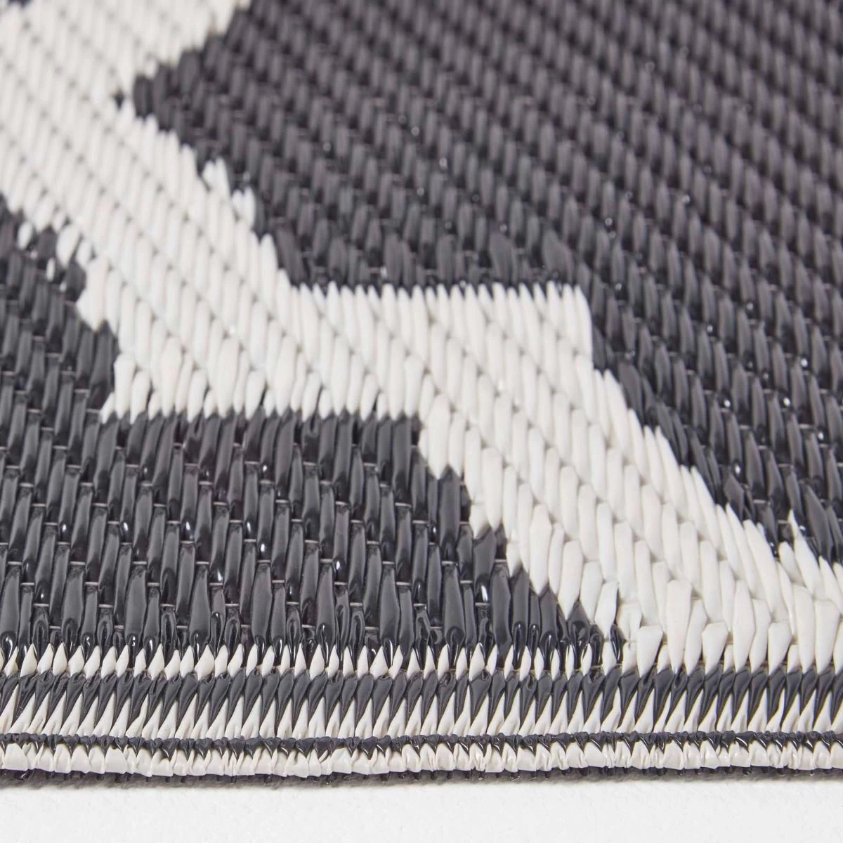 Black and white outdoor rug woven from 100% recycled plastic this contemporary garden rug features a stylish geometric pattern is light weight and weather resistant.