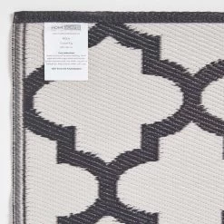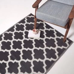 Black and white outdoor rug woven from 100% recycled plastic this contemporary garden rug features a stylish geometric pattern is light weight and weather resistant.