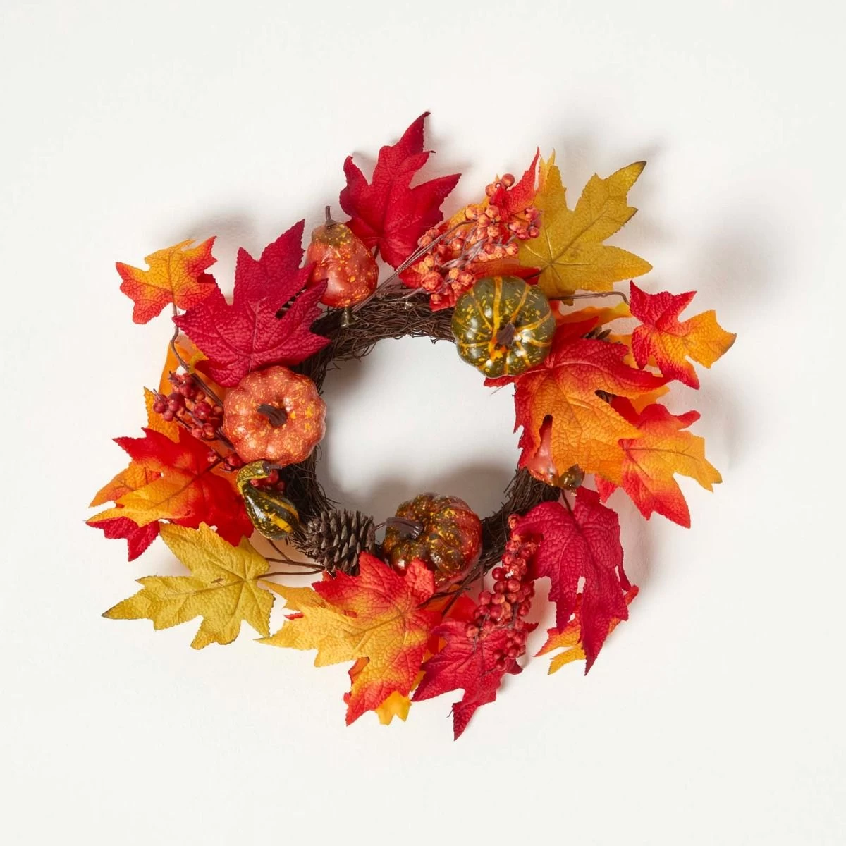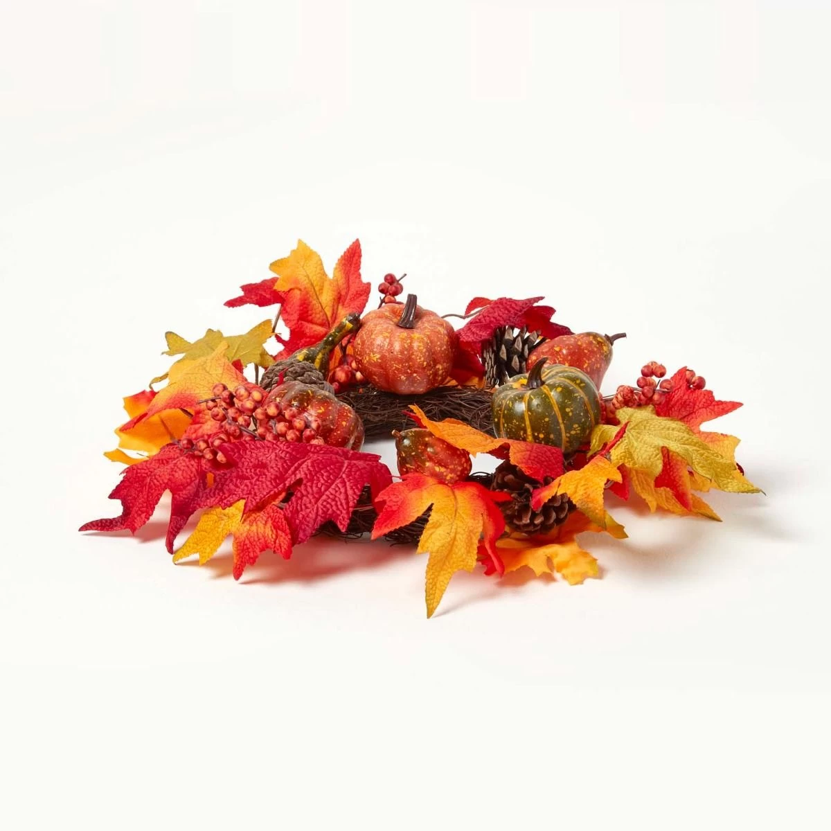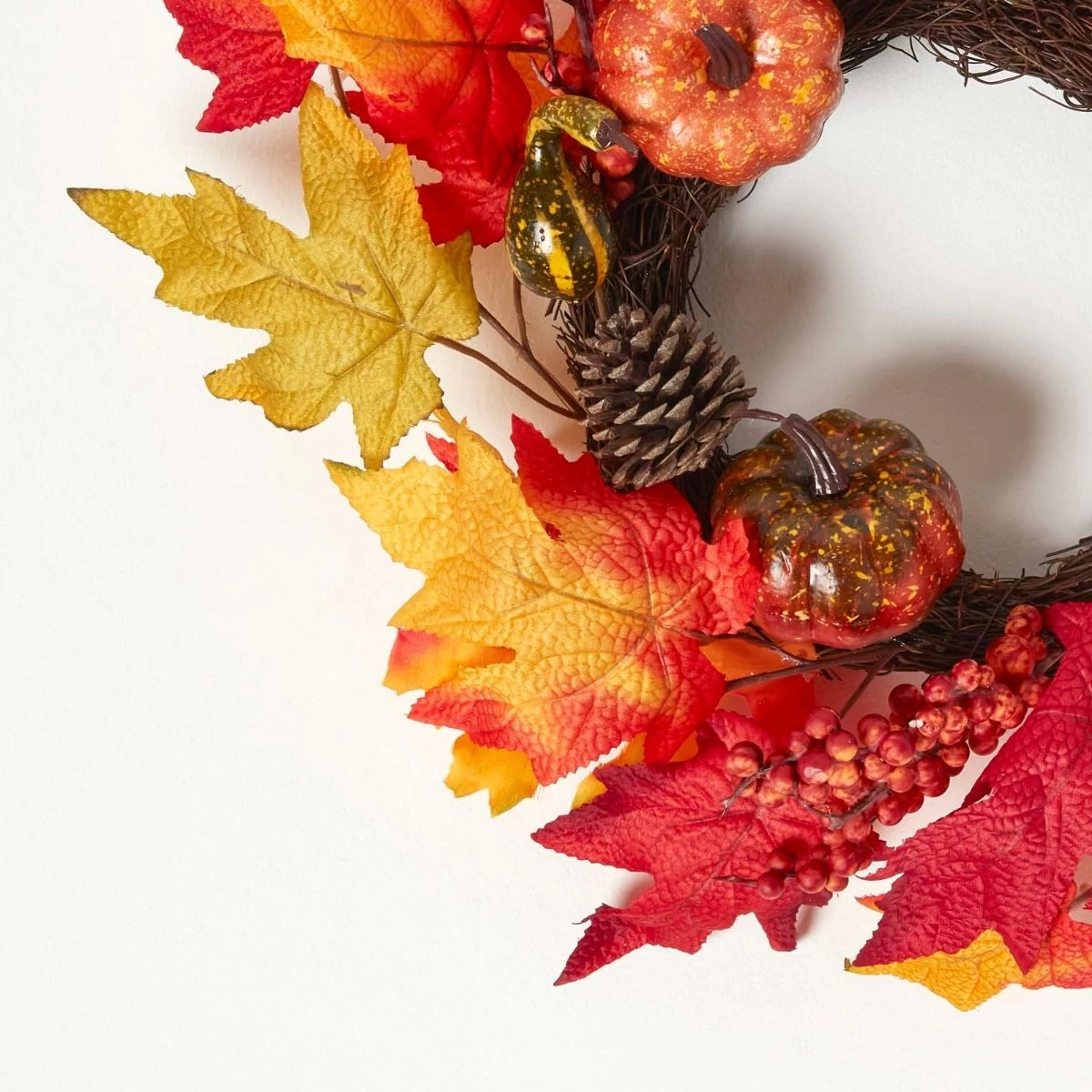 Colourful autumn wreath with orange and yellow maple leaves and mini pumpkins, this round door wreath is suitable for outdoor and indoor decoration.