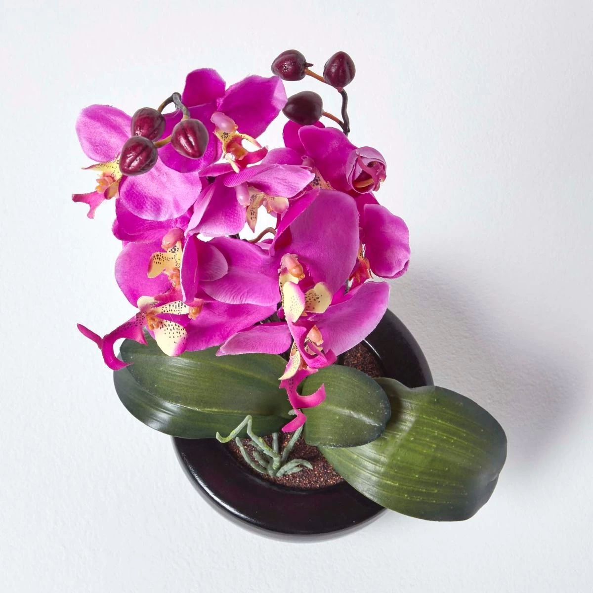 These elegant oriental style Cerise Orchids with silk flowers in a black bowl would make a lovely feature in any room, be it at home or at your workplace. The vibrant silk flowers with life like leaves make these stunning replica plants as good as any real plant. Orchids are timeless and this arrangement comes as an excellent alternative to growing and maintaining real plants. What a beautiful way to bring life to your interiors!