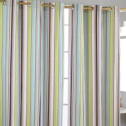 The various shades of green, white, pink, purple and blue used in these Osaka Green Stripes Eyelet Curtains all complement each other perfectly and will provide a fresh and bright look to any room. The modern design of these curtains is sure to renovate the interiors of any room, regardless of whether the decor is modern or traditional. These contemporary Osaka Green Stripes Curtains are one pair in Homescapes impressive range of pure cotton designer curtains in many charming designs and soft prints. Our modern ring top or eyelet curtains are made with heavy cotton fabric and a wide range of colours, which allows our curtains to coordinate well with almost any interior setting and the vivid colours used are able to uplift the mood of any room. These curtains are suitable for all spaces, and would fit perfectly in the kids rooms due to their refreshing print. Please note, these curtains are not lined and so they will have to be used in conjunction with a black out curtains in order to make them light proof. Coordinating fabric (to make your own soft furnishings), cushions and floor cushions are also available with Homescapes.