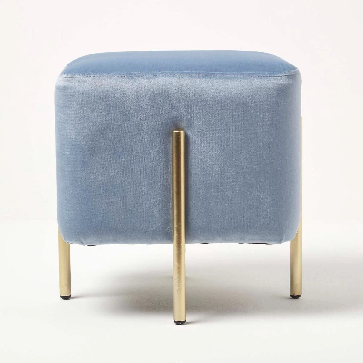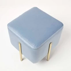 Contemporary cube light blue velvet footstool, upholstered in a super-soft velvet with sleek gold metal legs creating the perfect on-trend look for any interior.