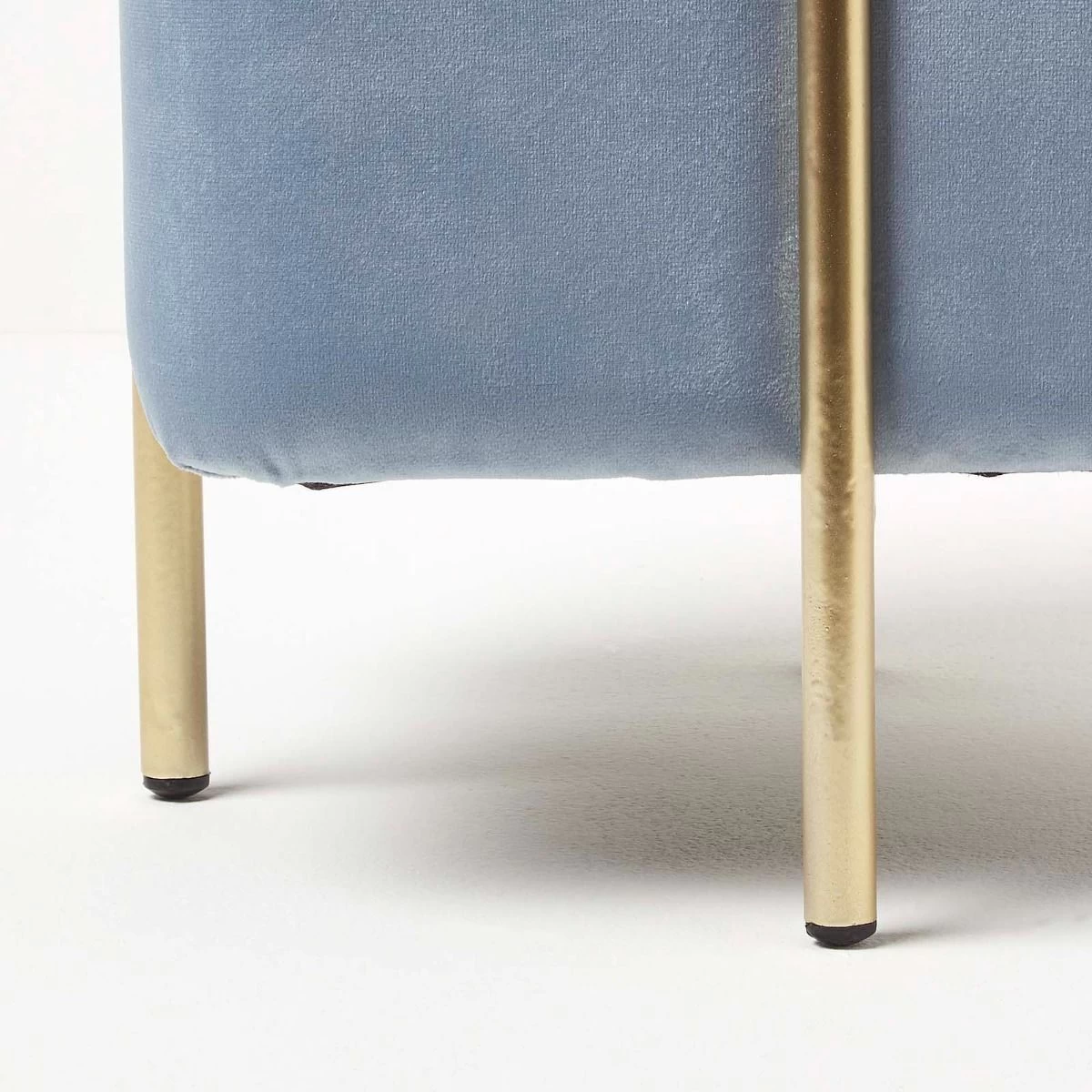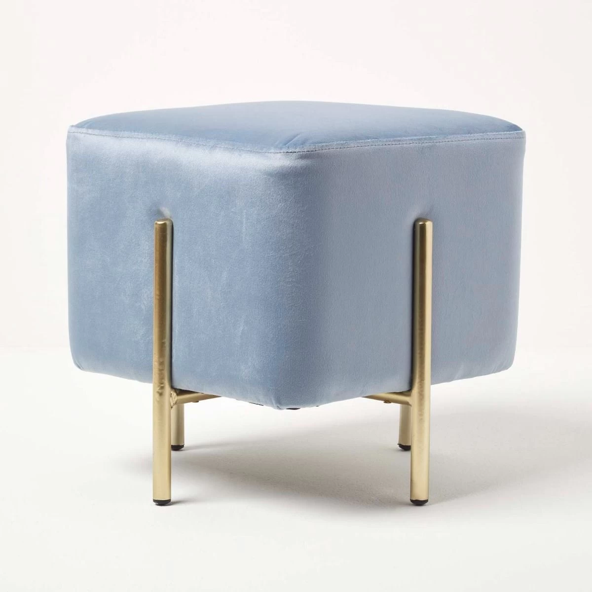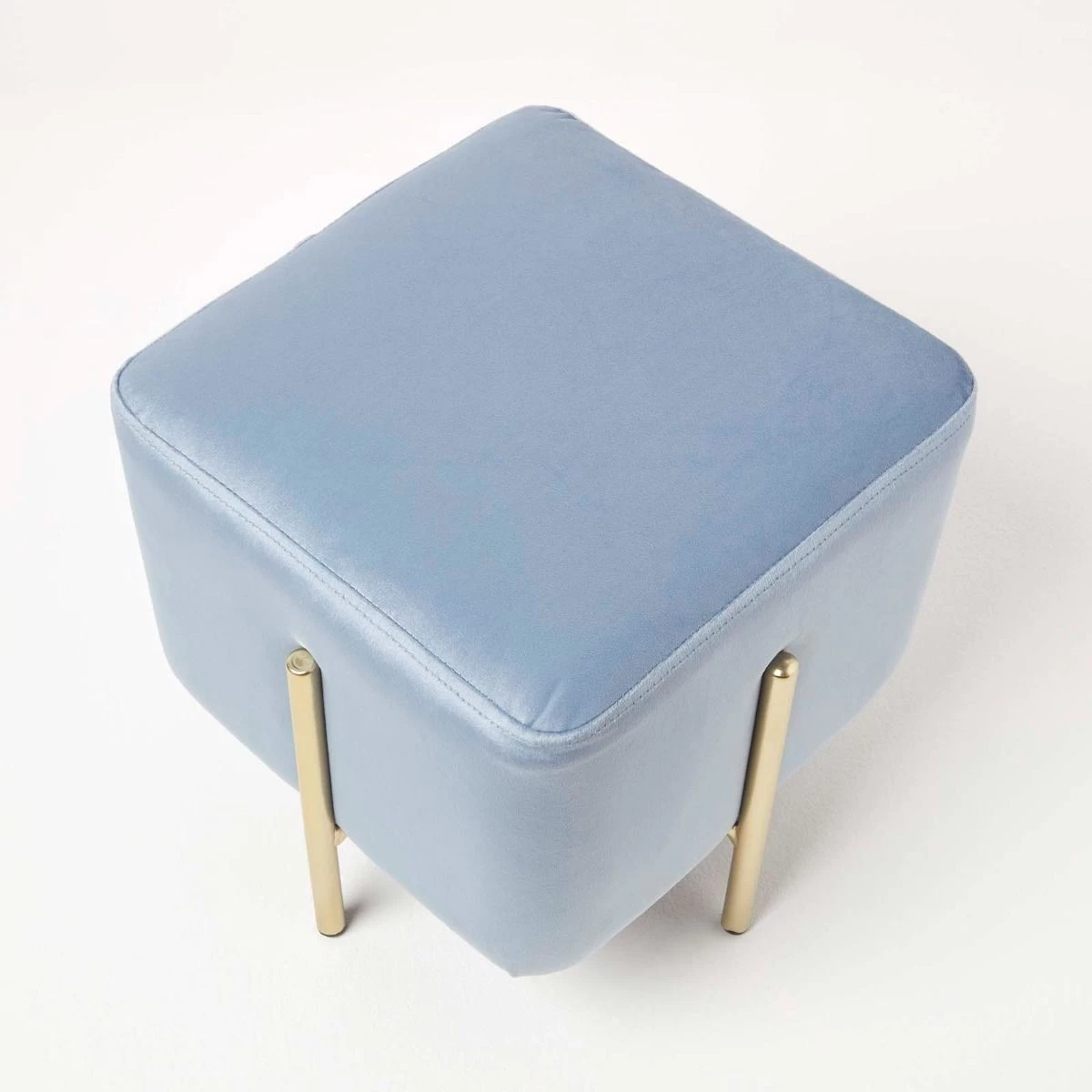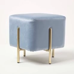 Add a touch of sophistication to your homes with the Osborne velvet footstool. Ideal for use within the bedroom or living room, this light blue pouffe is the perfect statement piece for your home. Resting on four golden metal legs, this cube pouffe is upholstered in our famously super-soft velvet for a glamourous touch. Multifunctional and convenient, this cube footstool can be used throughout the home as a footrest, occasional seat or the perfect contemporary decoration.
