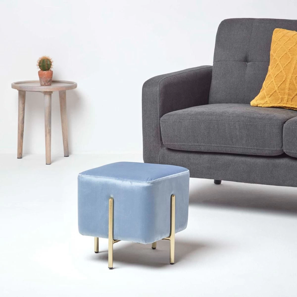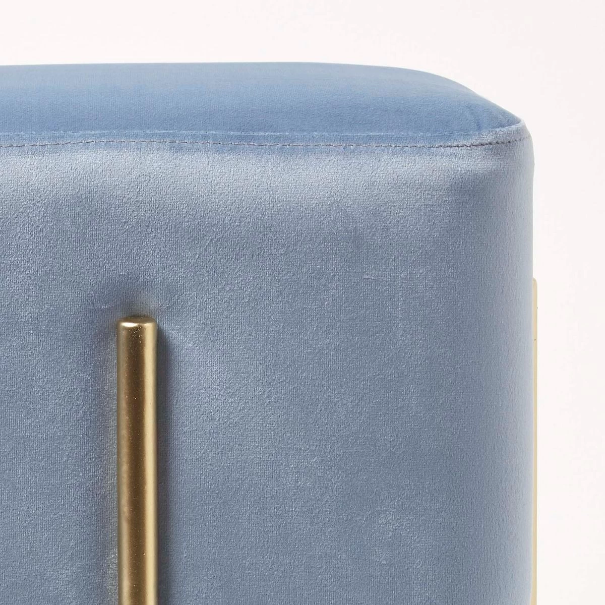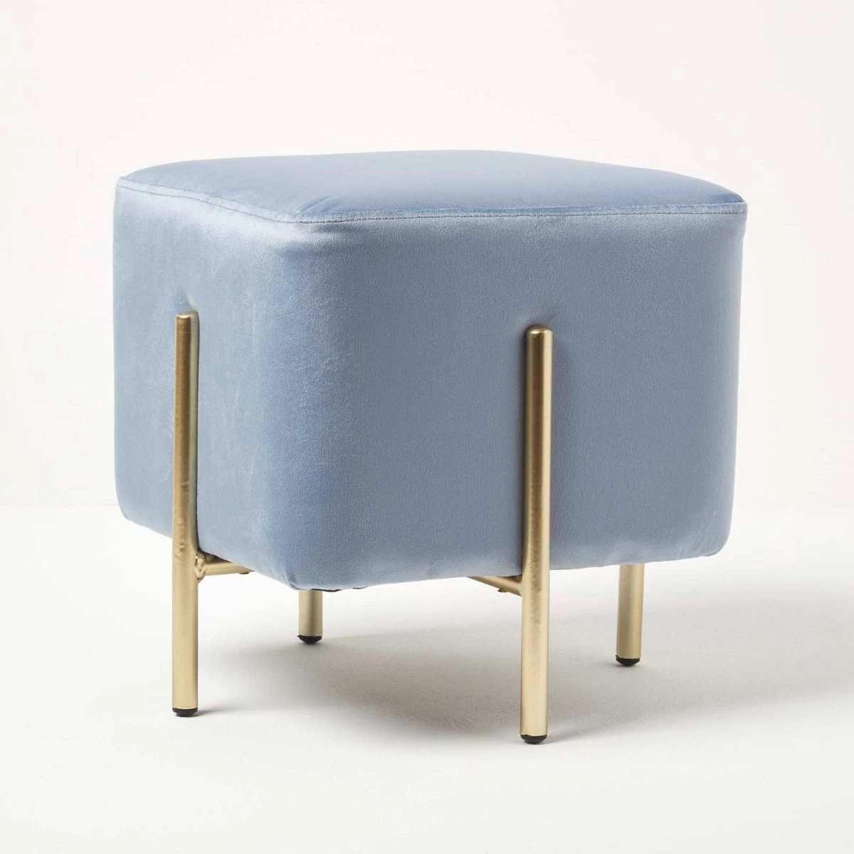 Add a touch of sophistication to your homes with the Osborne velvet footstool. Ideal for use within the bedroom or living room, this light blue pouffe is the perfect statement piece for your home. Resting on four golden metal legs, this cube pouffe is upholstered in our famously super-soft velvet for a glamourous touch. Multifunctional and convenient, this cube footstool can be used throughout the home as a footrest, occasional seat or the perfect contemporary decoration.