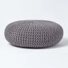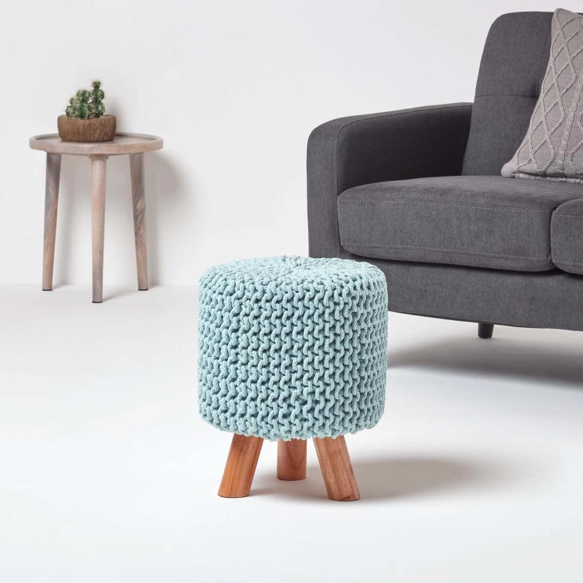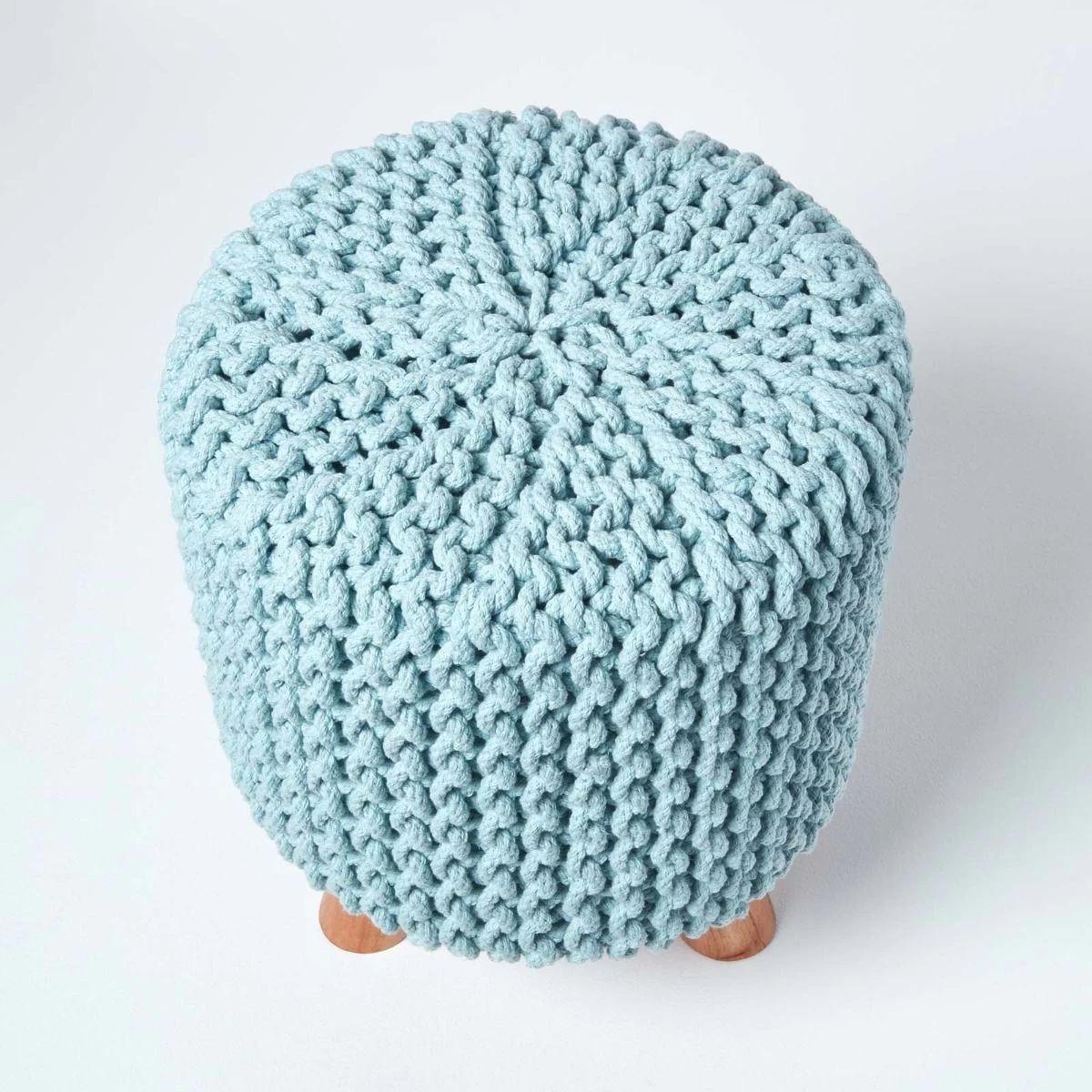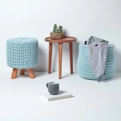 Baby blue pastel coloured knitted footstool made from 100% cotton, Homescapes tall, circular footstools are handmade and feature three wooden leg supports.