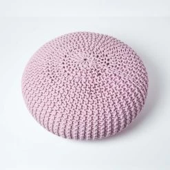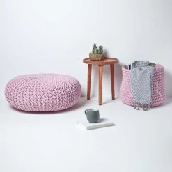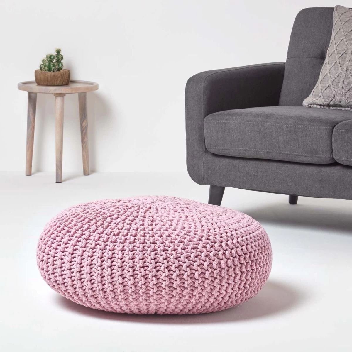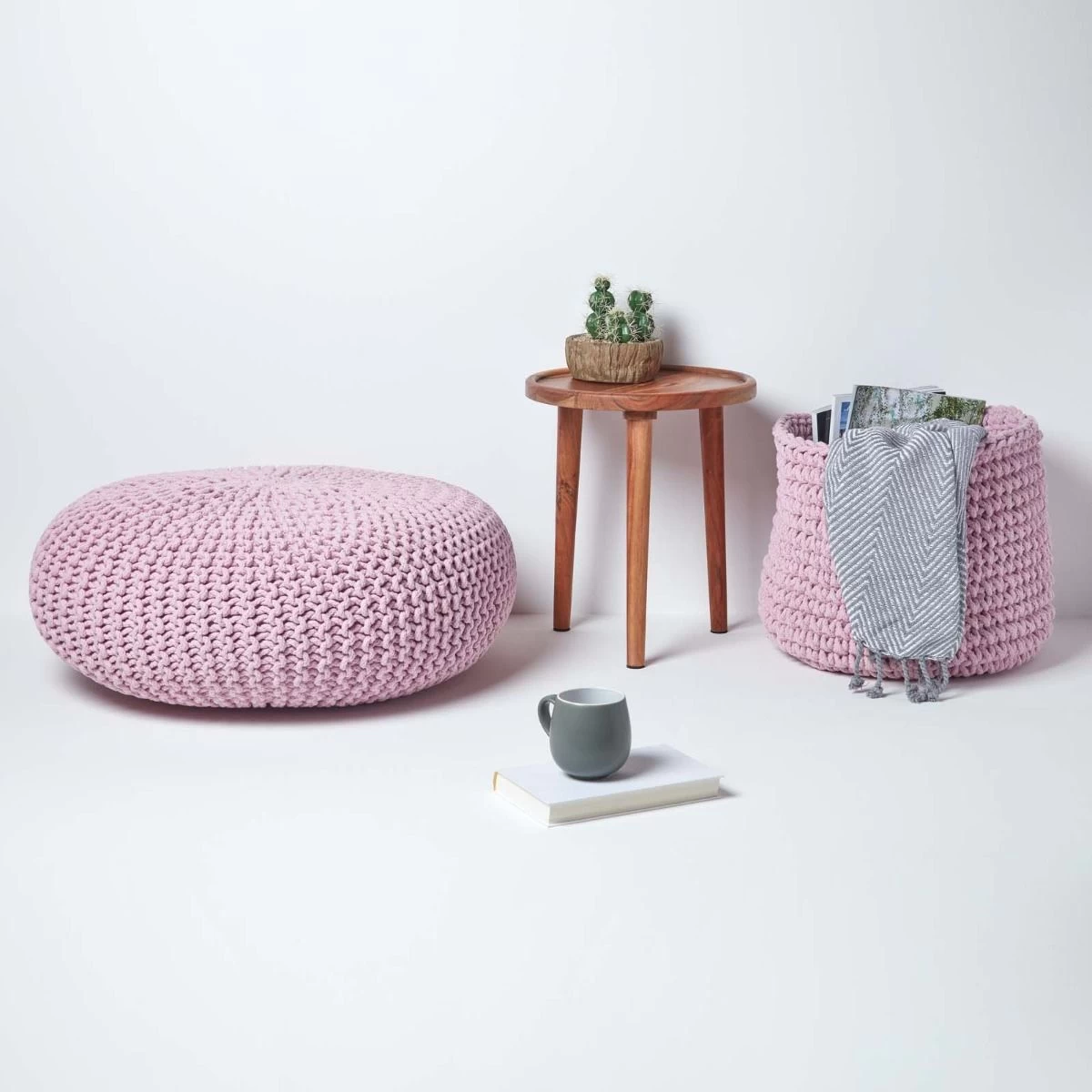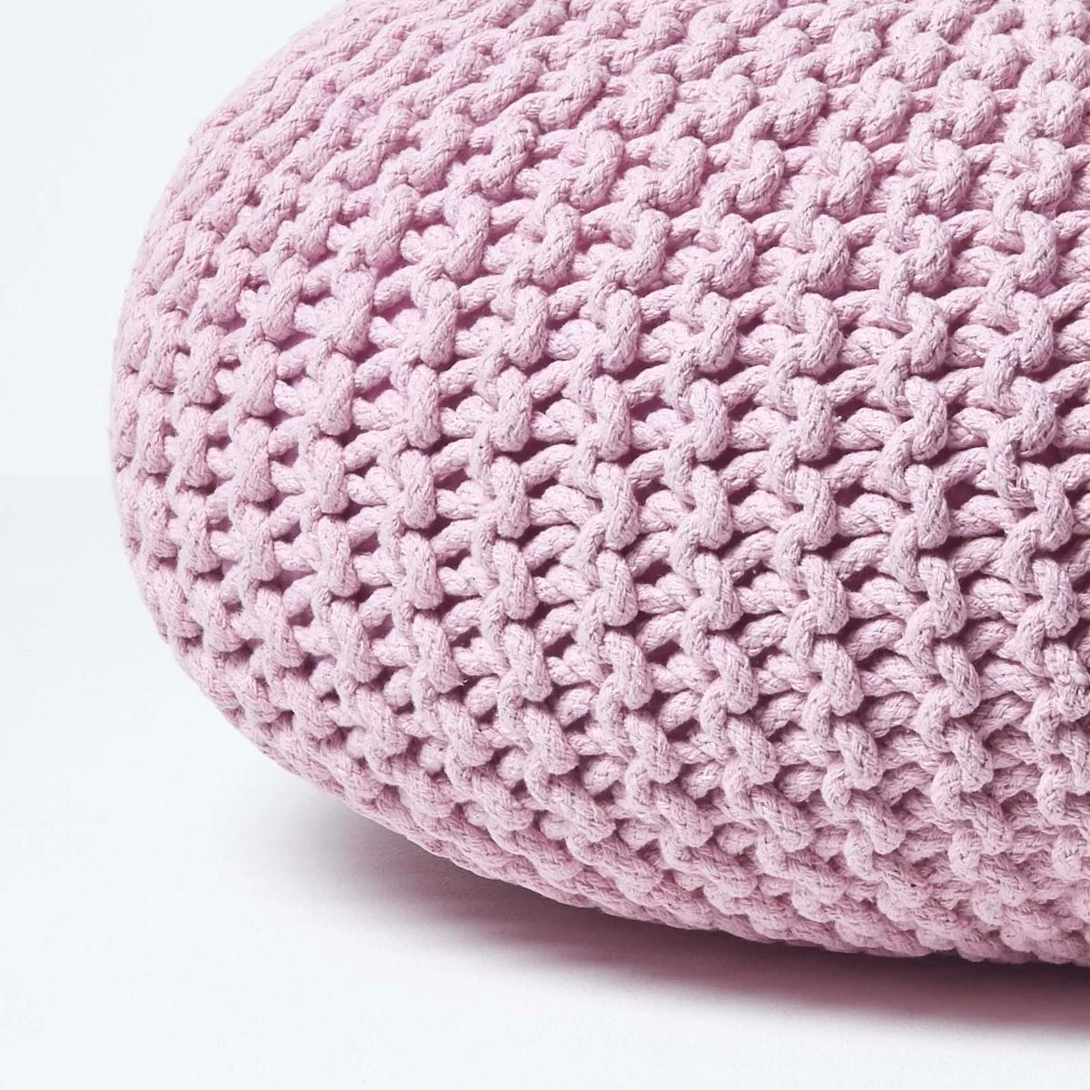 Large pastel pink round knitted pouffe, 70cm wide 100% cotton knitted floor cushion pre-filled with polystyrene beads and covered with on-trend chunky knit cotton.