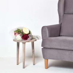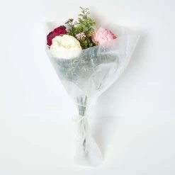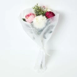 A faux flower bouquet, encased in decorated floristry wrap and tied together with a ribbon. Ideal for giving as a gift for any occasion, this stylish bouquet can be styled in a vase to create an evergreen look that will last and last.