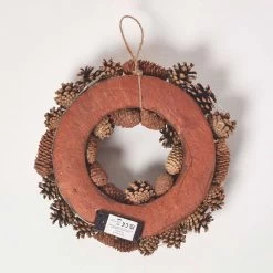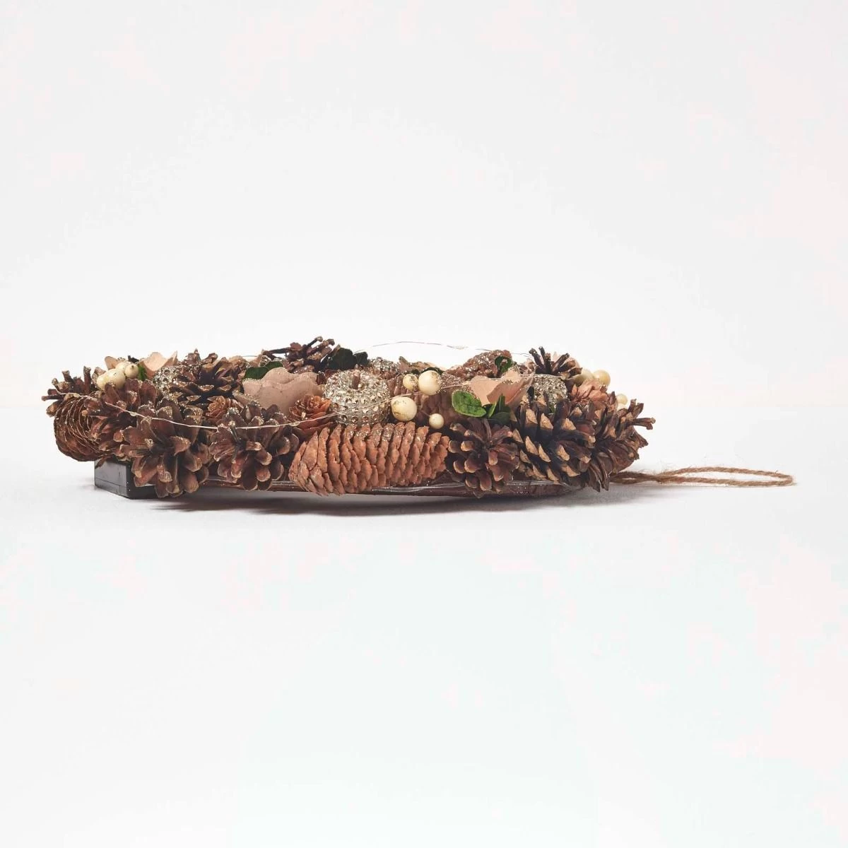 Ornate Christmas door wreath that will add a touch of traditional sparkle to your home. Measuring 36 cm wide, this gold wreath is covered in bronzed pine cones and gold decorations. A versatile decoration that can be used on doors or as a table decoration, suitable for both indoor and outdoor use, if using outside it is recommended to use on doorways that are sheltered.