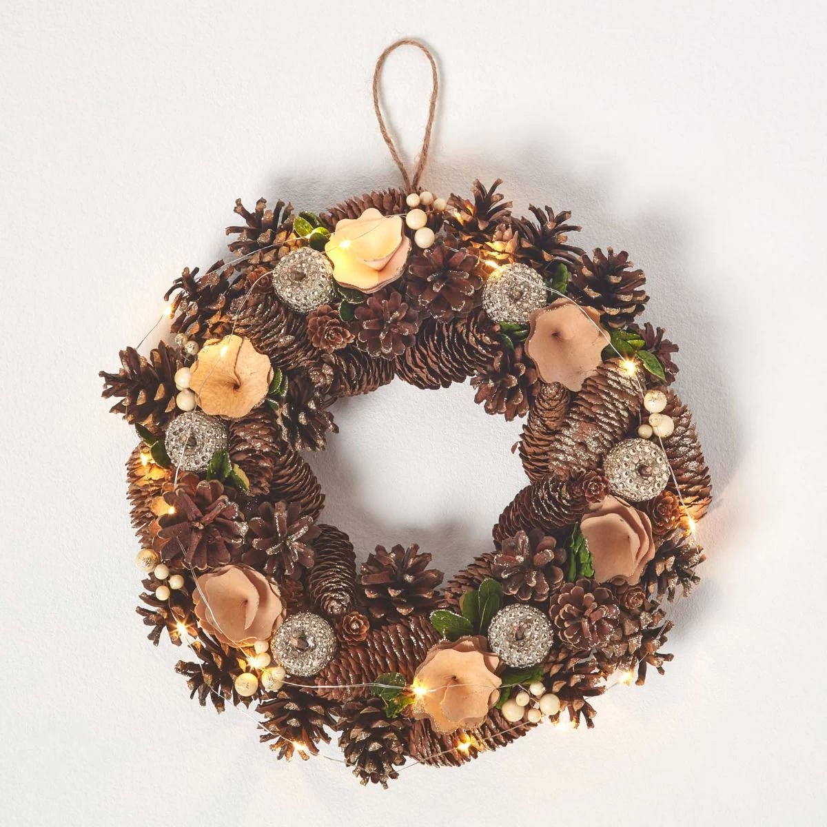 Adding a touch of sparkle to your home or front door, Homescapes gold Christmas wreath has inbuilt LED lights that will light up your home this festive season. Requires 2 AA batteries – not included.
