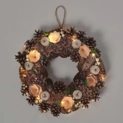 Light up Christmas wreath, traditional style Christmas door wreath for the festive season, this round gold wreath features pinecones and baubles.