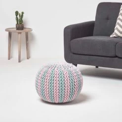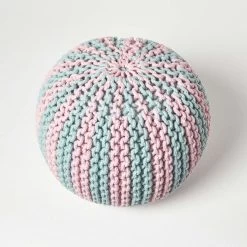 Soft pink and blue knitted footstool, woven from 100% cotton and generously filled with polystyrene beads, round footstool with colourful striped design.