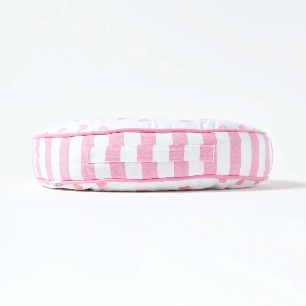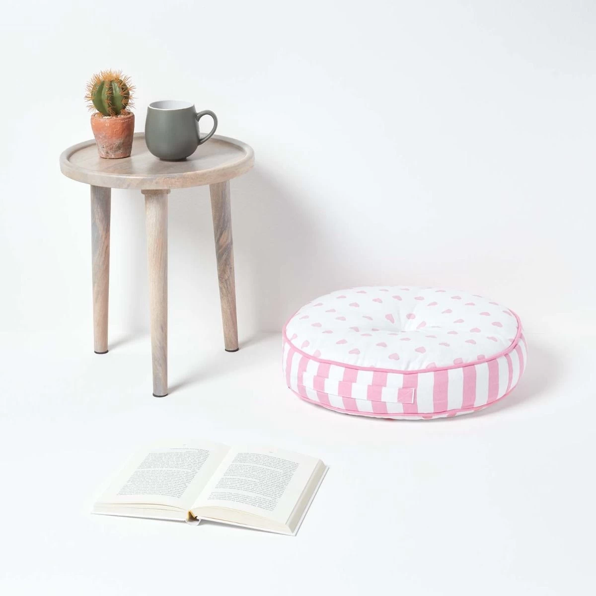 Round pink and white hearts and stripes floor cushion, indoor and outdoor filled floor cushion, 100% cotton circular cushion with soft super microfibre filling.