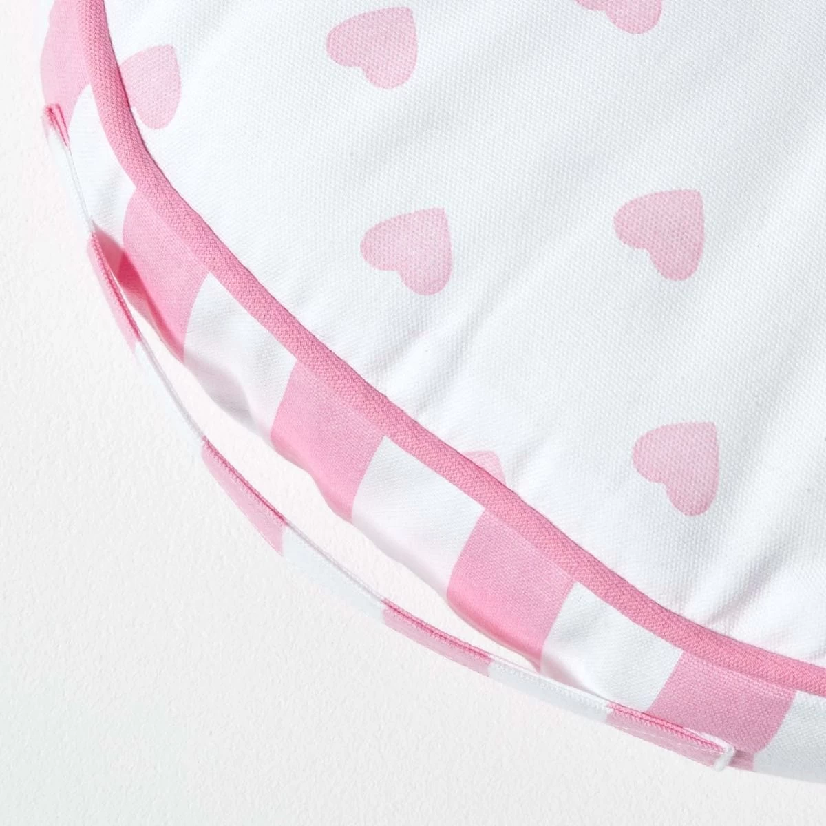 Pink and white round cushion suitable for indoor or outdoor use. Circular cushion filled with super microfiber and covered in a 100% cotton pink heart decorated case. This versatile cushion can be used in doors in children’s bedrooms or playrooms or outside on garden furniture.