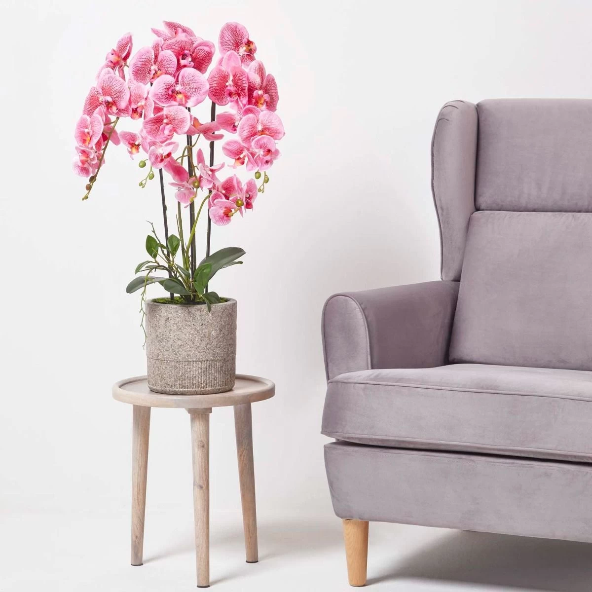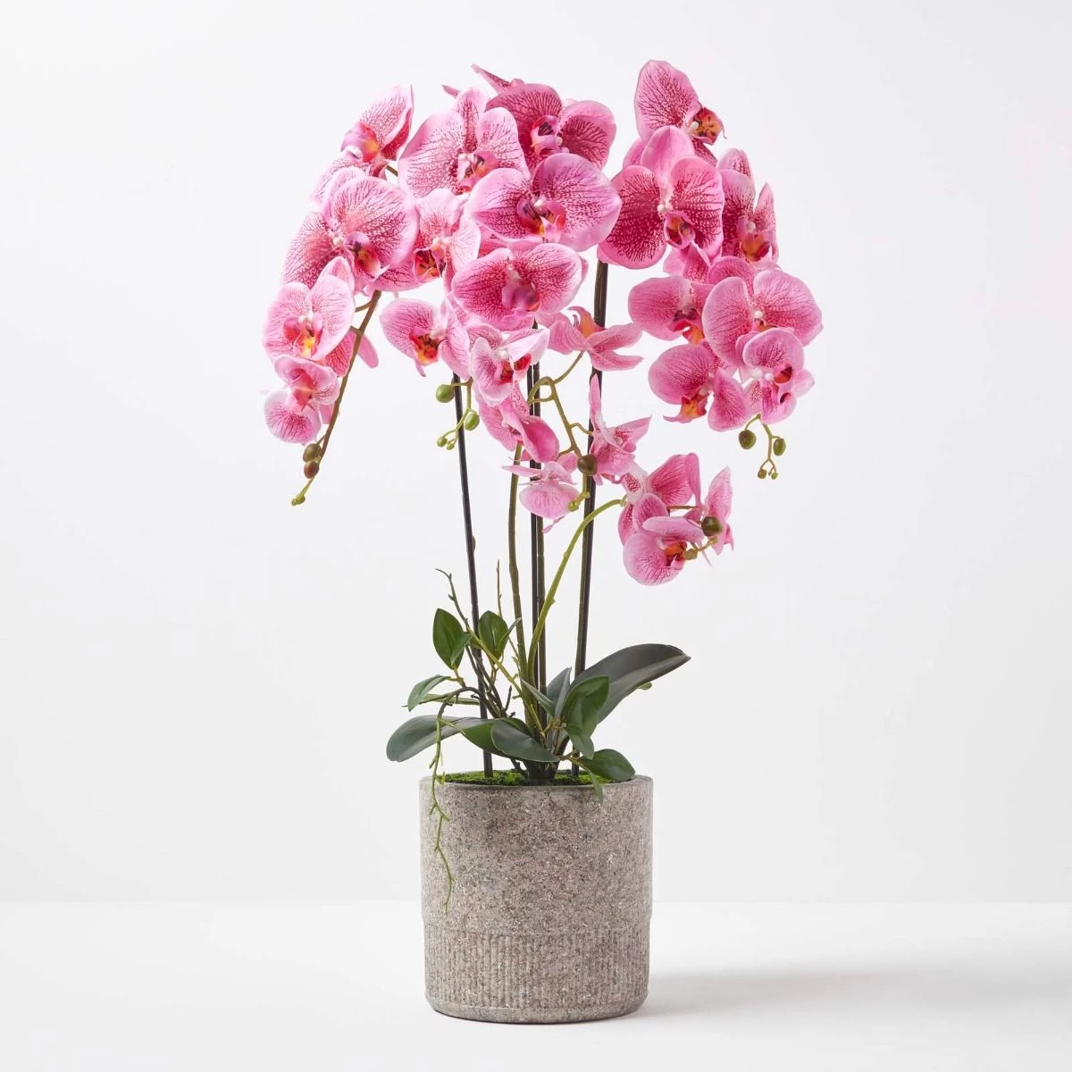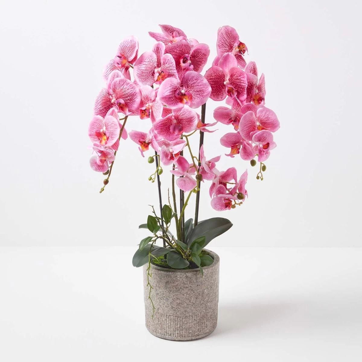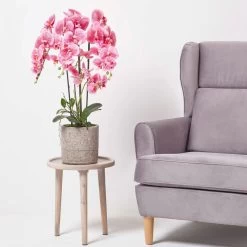 Giant Phalaenopsis pink artificial orchid from Homescapes in a decorative light grey cement pot, ideal for adding style and colour to contemporary interiors.