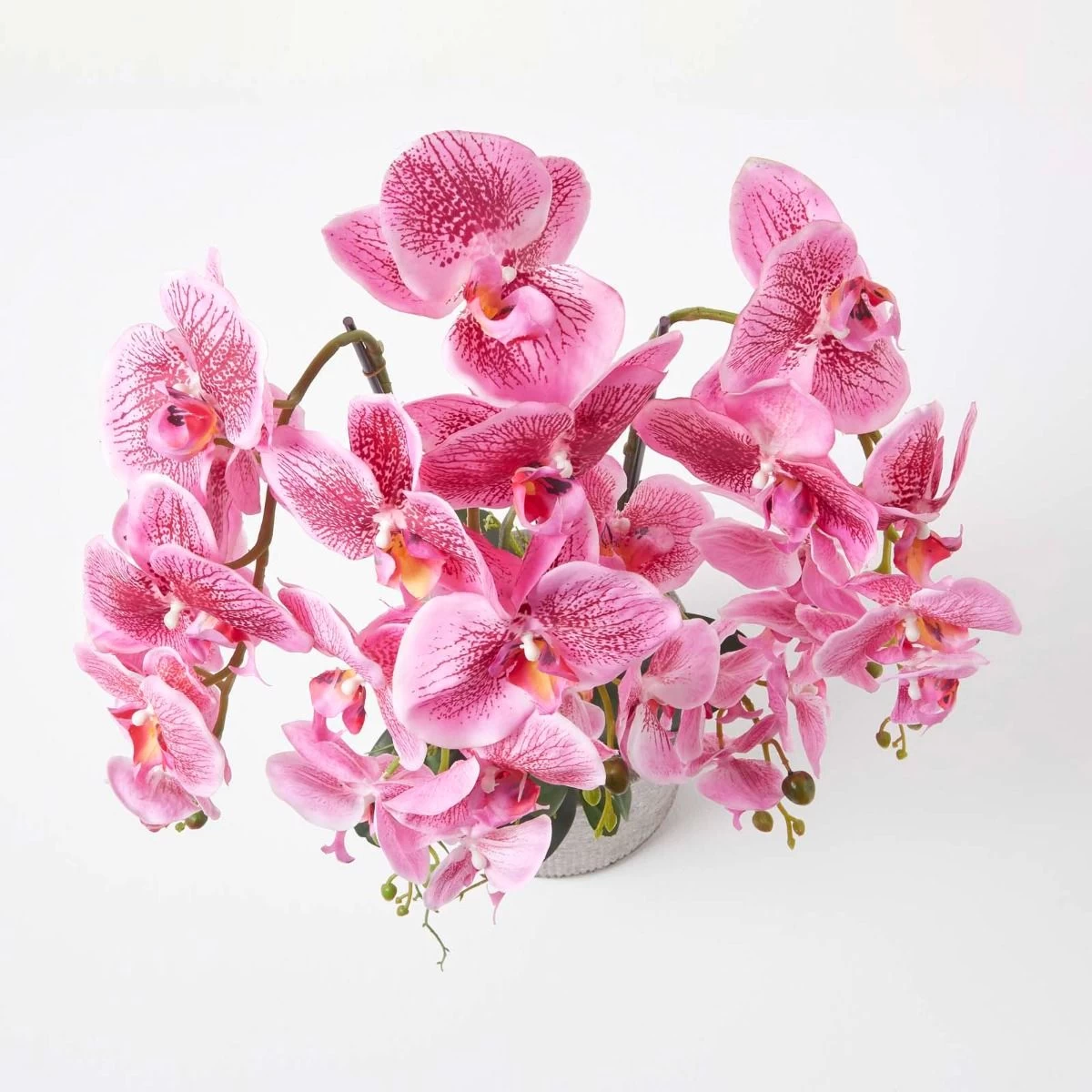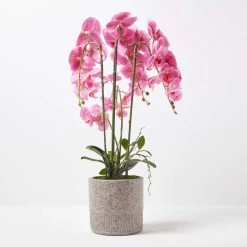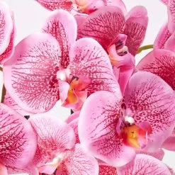 Crafted from silk-like polyester for botanical accuracy, this artificial pink orchid is perfect for adding style to side tables or windowsills to brighten up living spaces. This artificial orchid plant features stunning pink artificial orchid flowers with handcrafted petals giving them a realistic and stylish look. With lifelike stems, soil and leaves this artificial orchid can be arranged to your liking and is just like the real thing.