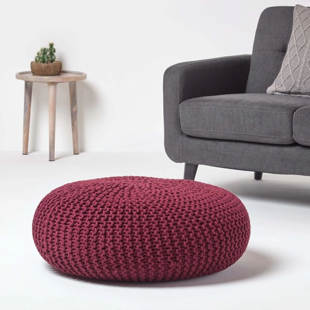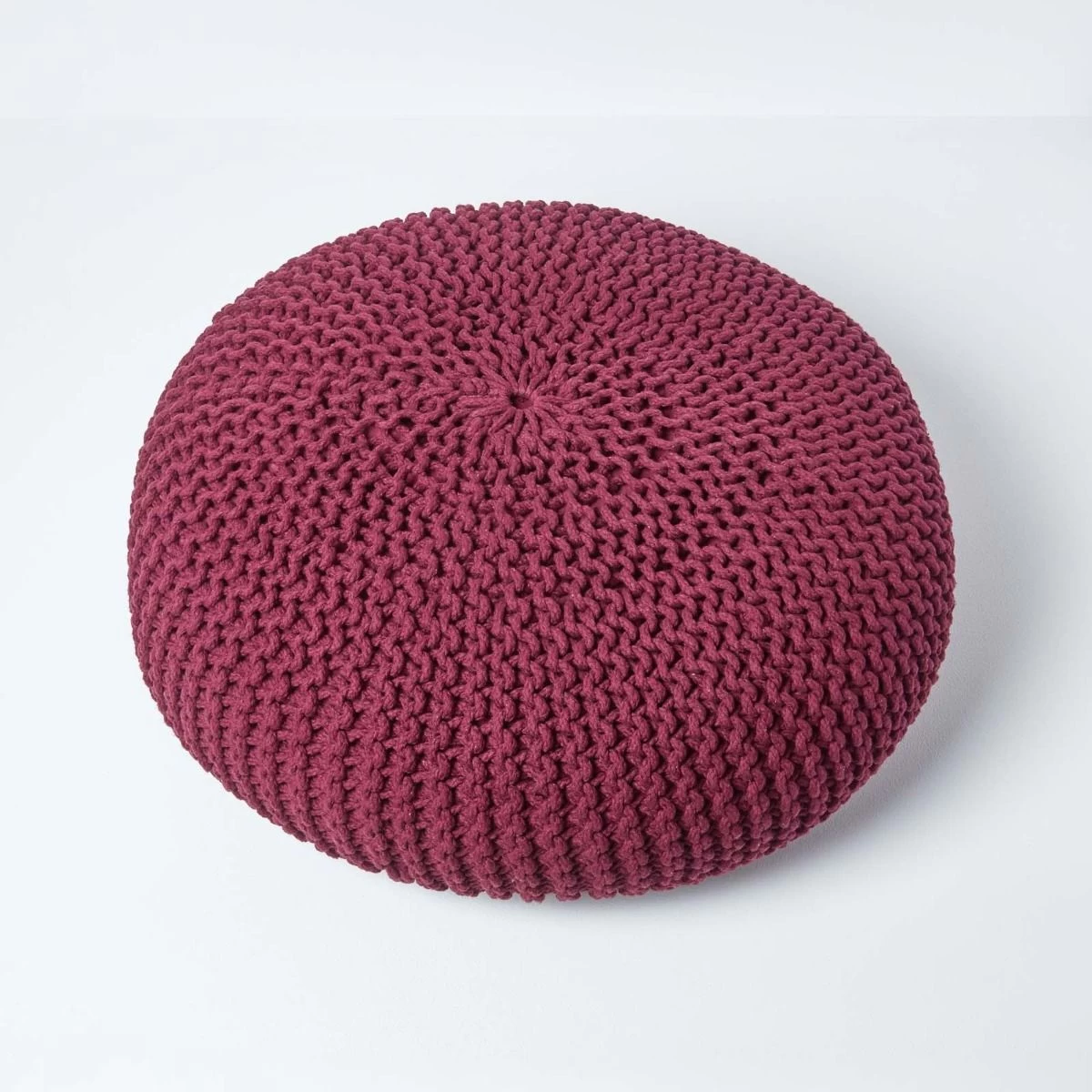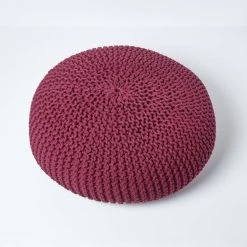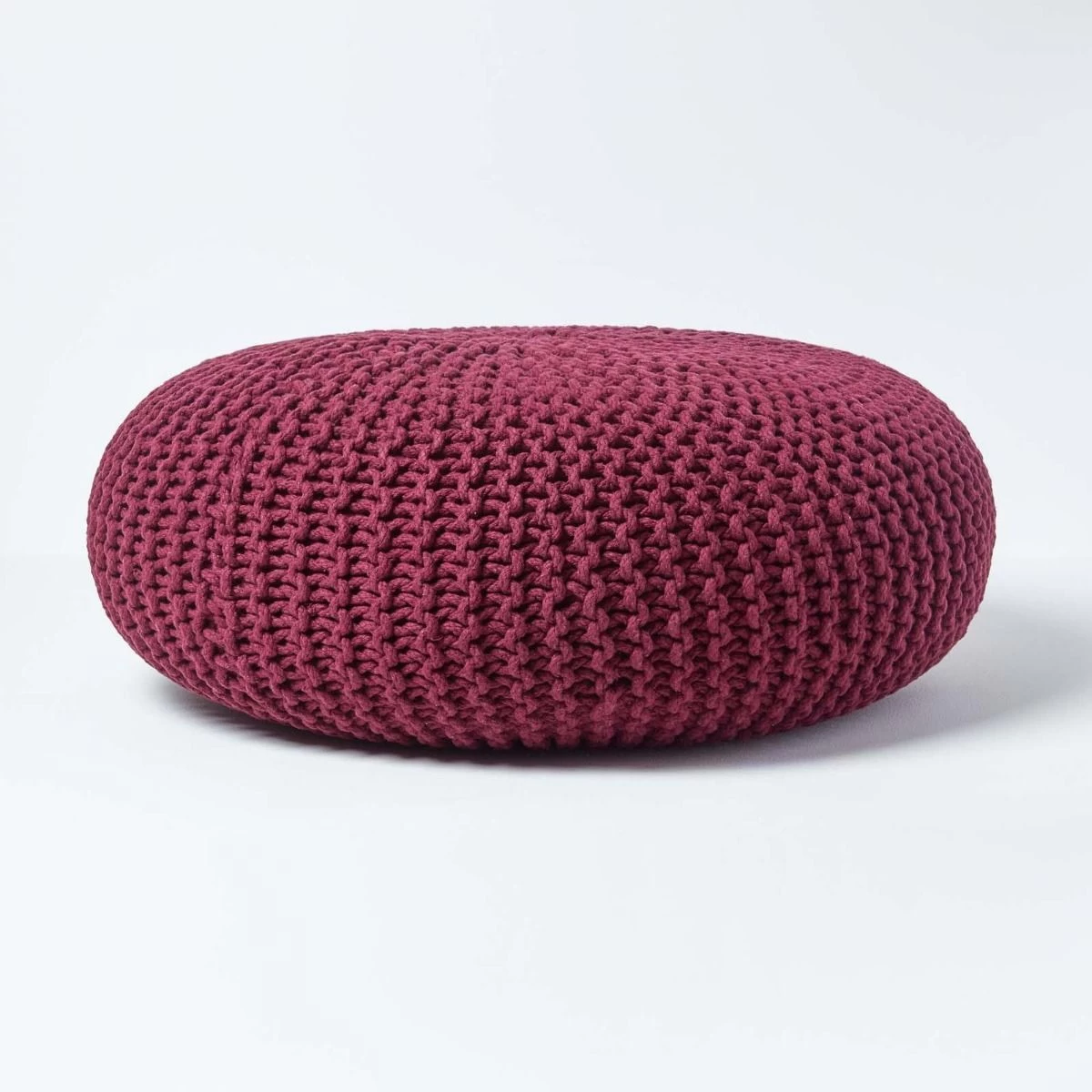 A large and vibrant knitted pouffe measuring 70cm wide, this flat footstool is hand woven from a deep plum purple 100% cotton. Tightly filled with polystyrene balls this footstool is designed for daily use and can also be used as an occasional coffee table or floor cushion. Part of Homescapes collection of pouffes and footstools this design is available in several neutral and exciting colours.