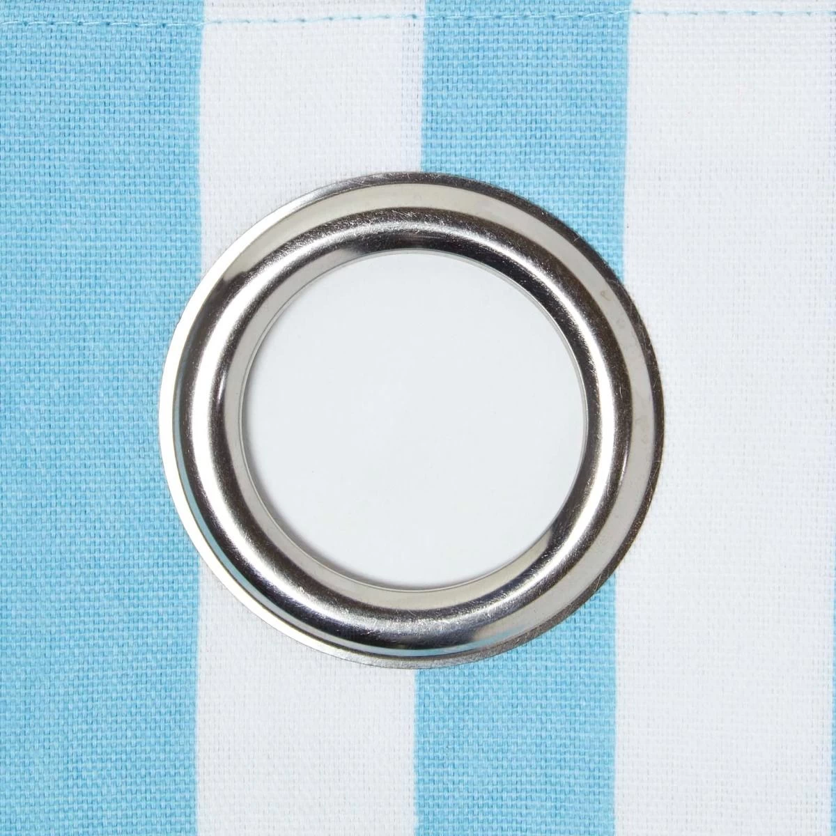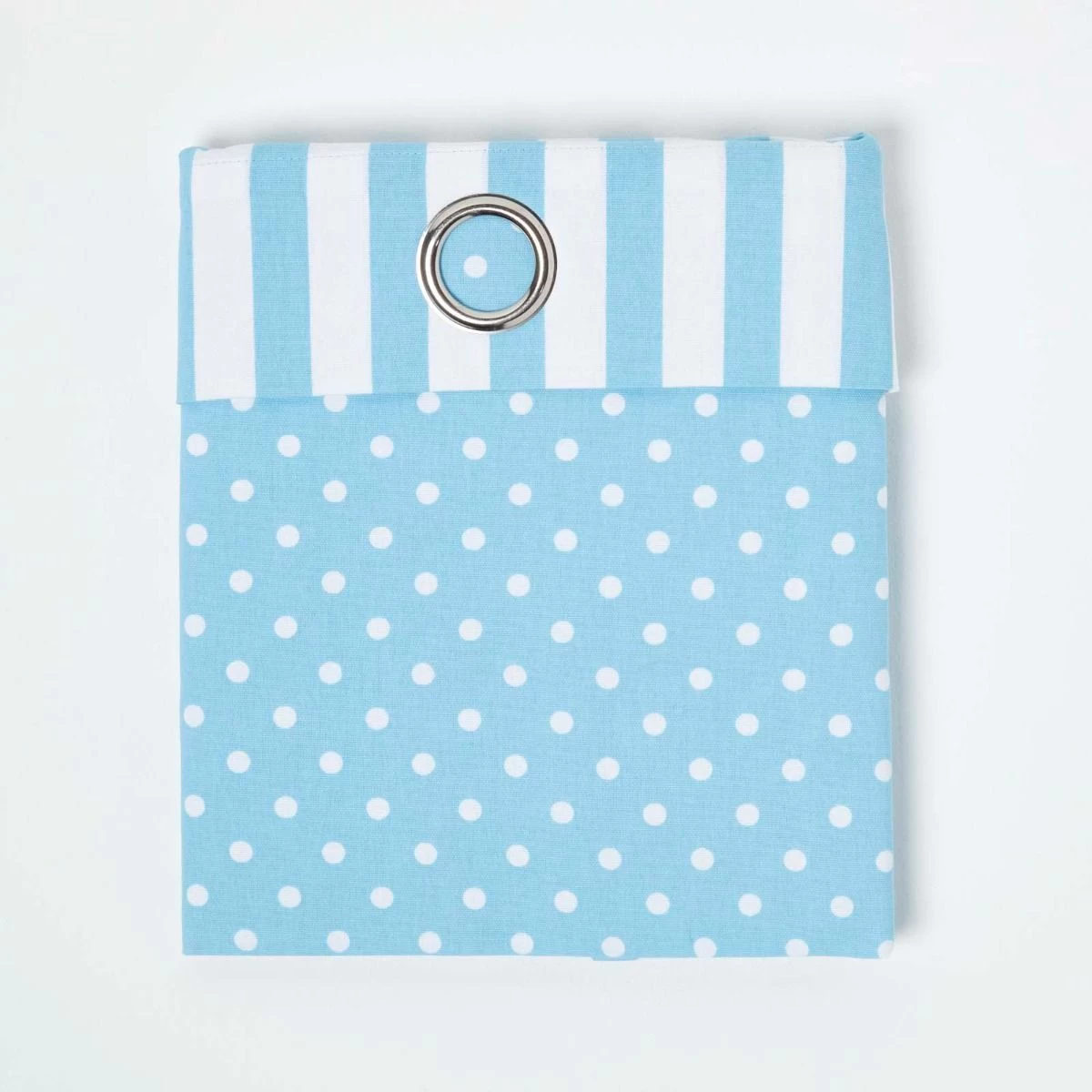 The conventional polka dot design has been renovated in our Polka Dots Blue Eyelet Curtains as it has been paired with a very modern blue and white striped design. This cool shade of blue accentuates the white dots and stripes perfectly, and these curtains are the ideal interior accessory to add a contemporary twist to any room. These chic Polka Dots Blue Curtains are one pair in Homescapes impressive range of pure cotton designer curtains in many charming designs and soft prints. Our modern ring top or eyelet curtains are made with heavy cotton fabric and a wide range of colours, which allows our curtains to coordinate well with almost any interior setting and the vivid colours used are able to uplift the mood of any room. These curtains are suitable for all spaces, and would fit perfectly in the kids rooms due to their refreshing print. Please note, these curtains are not lined and so they will have to be used in conjunction with a black out curtains in order to make them light proof. Coordinating fabric (to make your own soft furnishings), cushions and floor cushions are also available with Homescapes.
