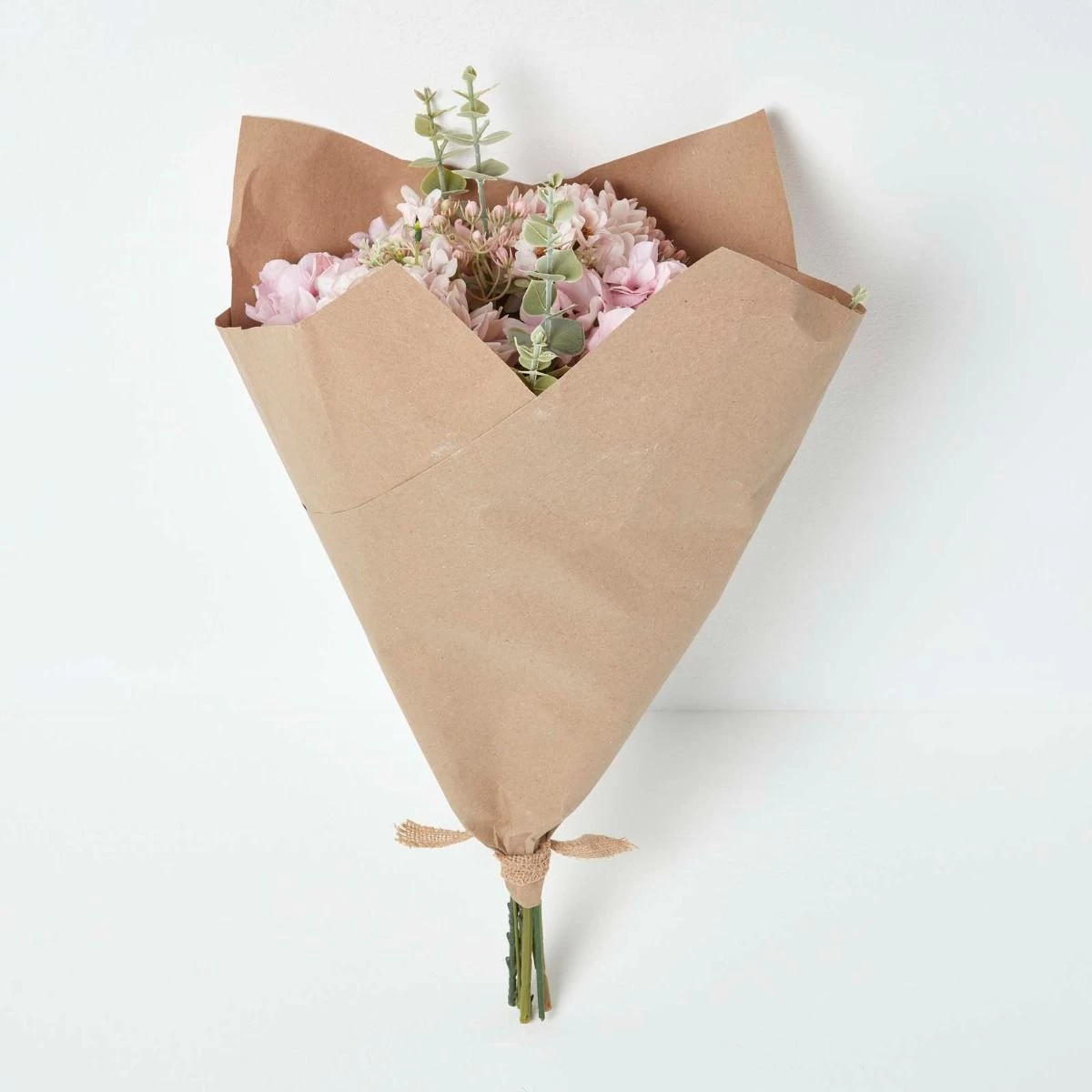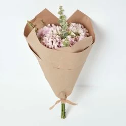 A low maintenance gift that will last and last. Tied at the base with a jute ribbon and carefully gift-wrapped in brown paper, this mixed flower bouquet will brighten up even the darkest corners of your interior. Pair with a Homescapes vase for the complete look.