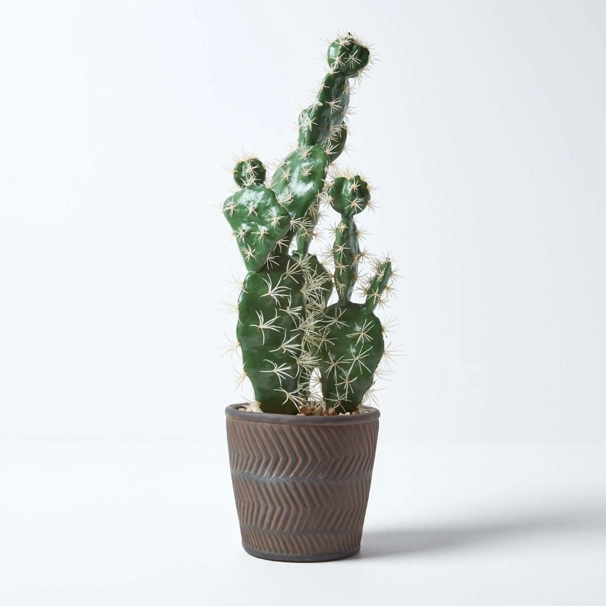 Create a botanical look in your home with Homescapes’ range of artificial plants and cacti including this tall faux Prickly Pear cactus. Featuring several cacti arms with artificial hair-like spines, this cactus will look great on your desk, bedside table or shelf. It comes inside a textured decorative pot so it is ready to display in your home.