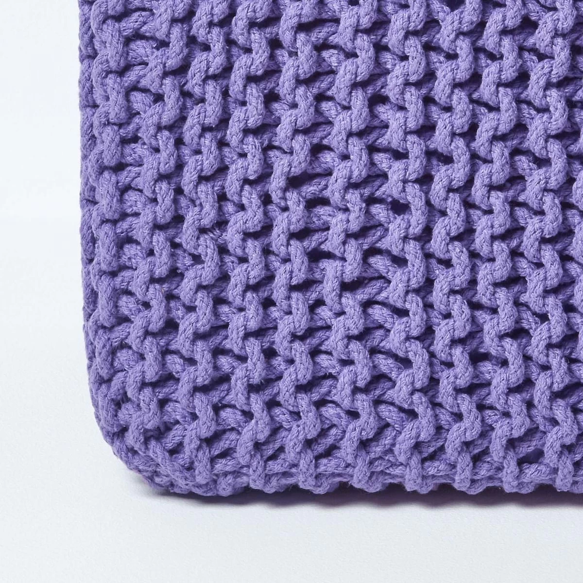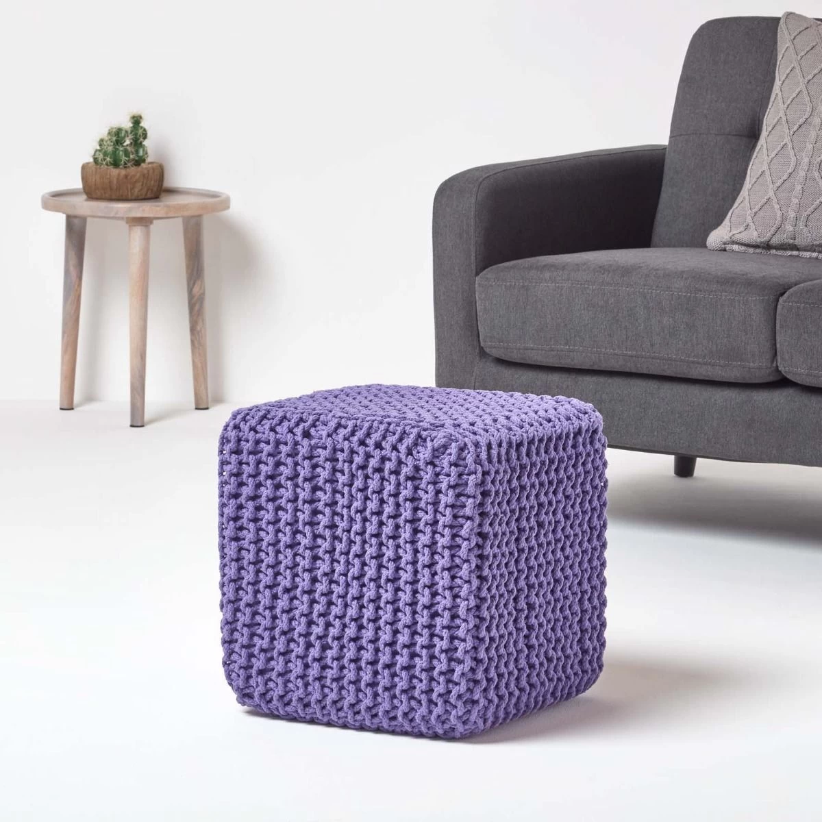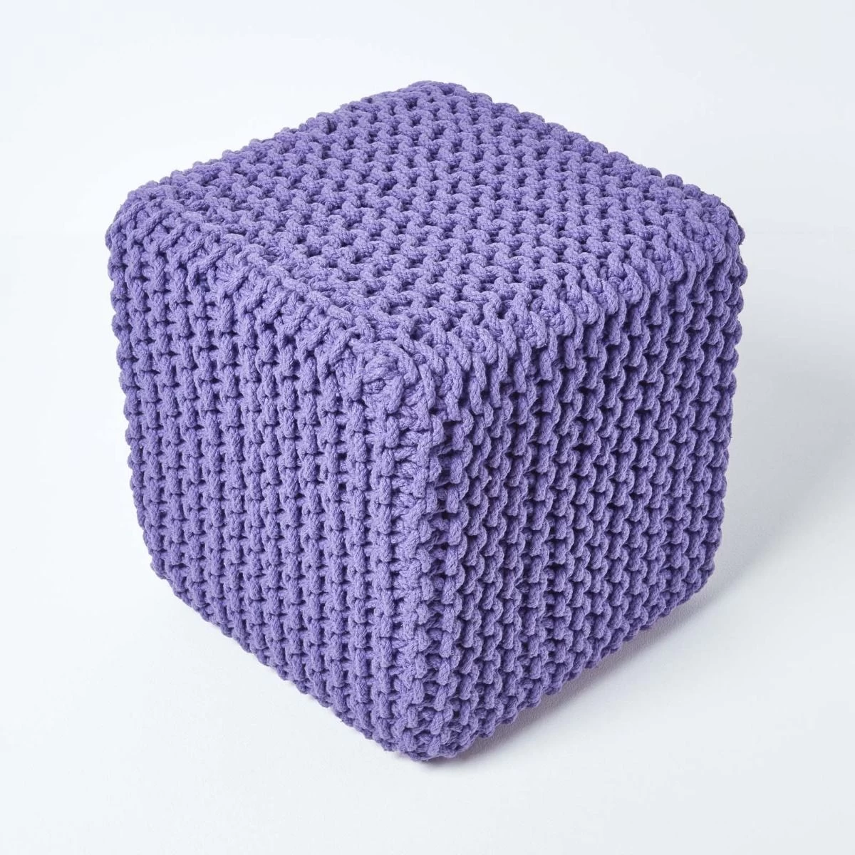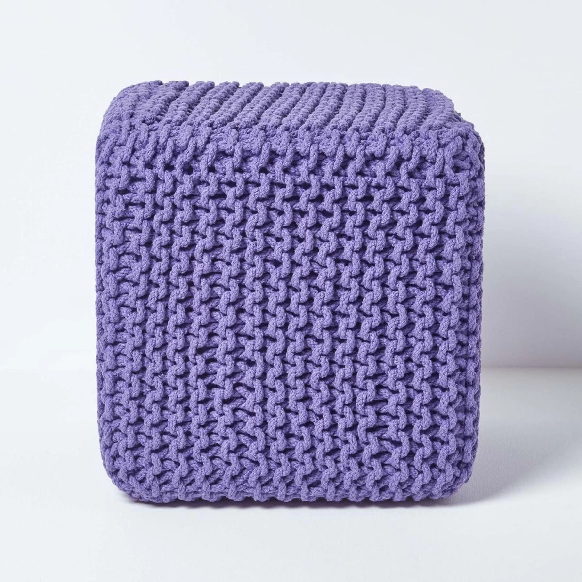 Purple Knitted Cube Footstool from our well designed large collection of pouffes and cubes is made up of 100% cotton.These chunky fashionable range of cubes are hand knitted with a strong compressed polystyrene cube filling. These are reasonably priced and are available in two classic shapes and ten vibrant colours. Without doubt, these multipurpose pouffes and cubes prove to be an indispensable home accessory.