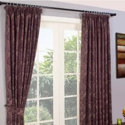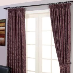 Featuring an ornate, floral damask-style motif, these intricately woven purple curtains are pencil pleated and fully lined for a classic look and a full drape.