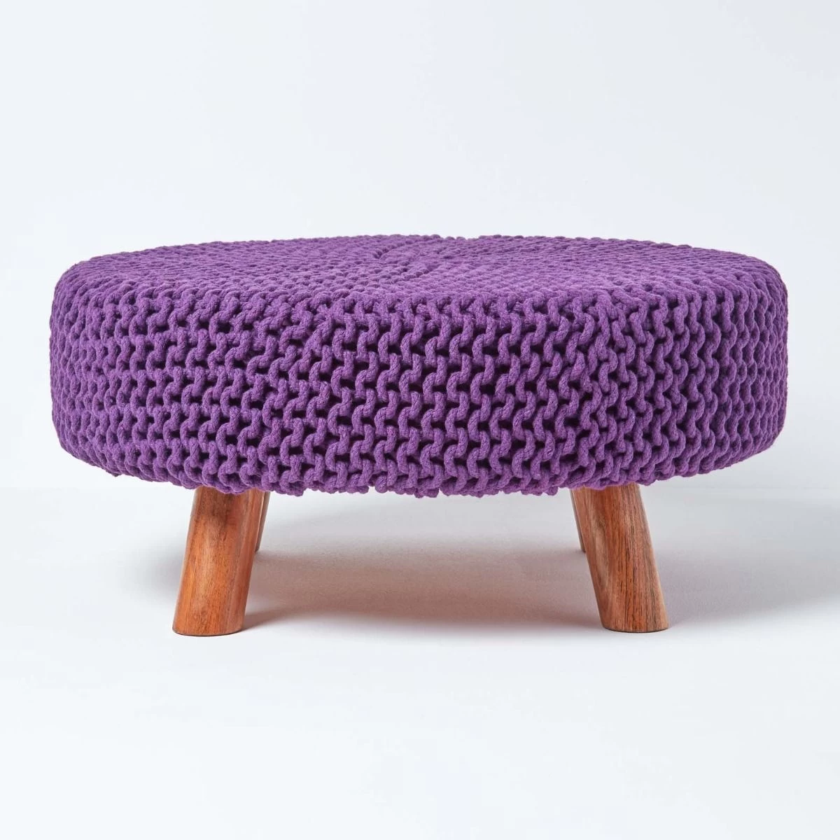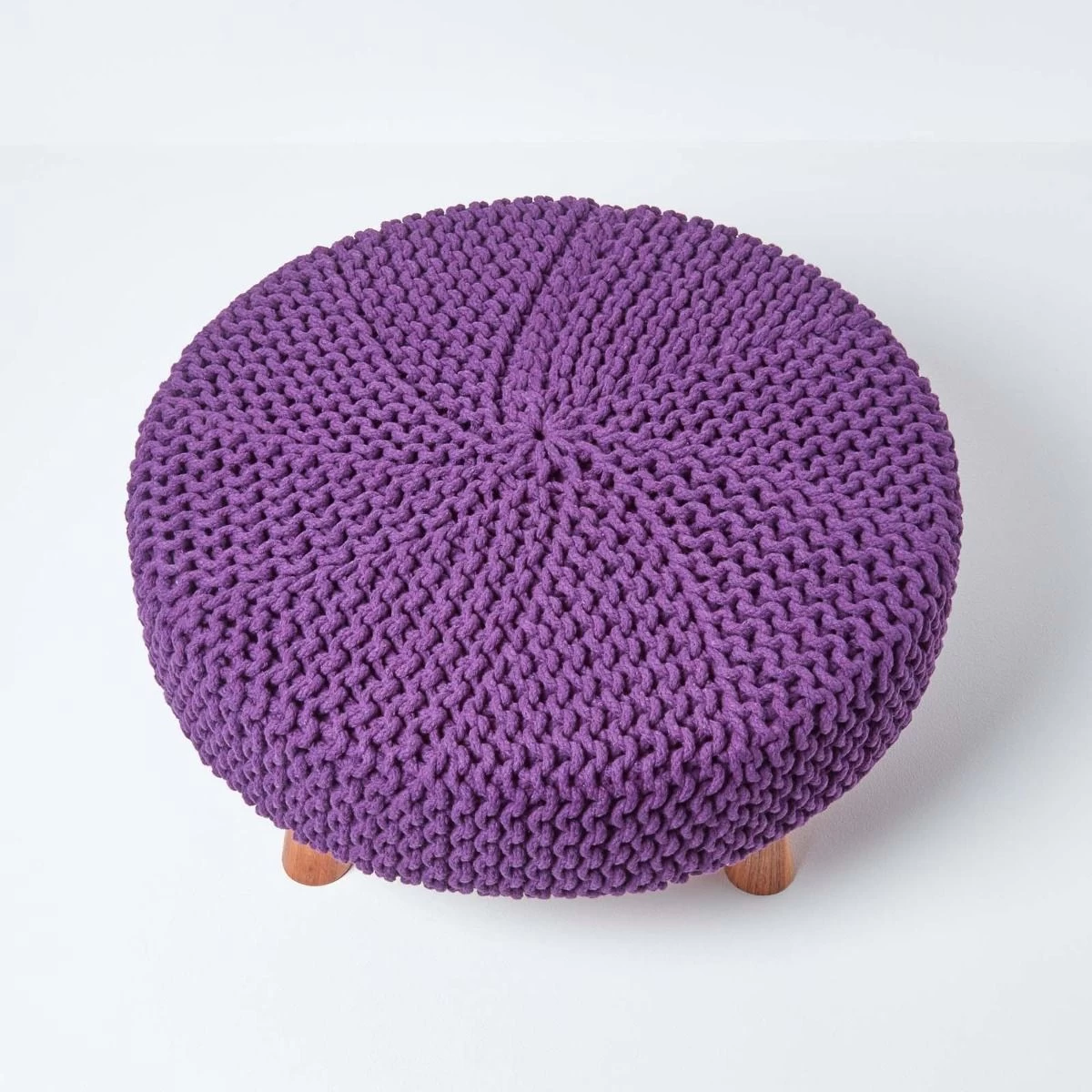 Introduce a burst of colour and style to your home interiors with Homescapes’ 100% cotton purple knitted footstool, with sturdy wooden legs measuring 62cm wide.