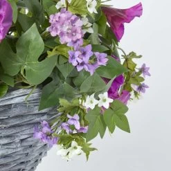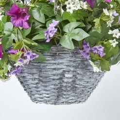 Vibrant artificial petunia hanging basket, lifelike handcrafted potted plants in a rustic style wicker basket, replica artificial trailing plant for indoors and outdoors.