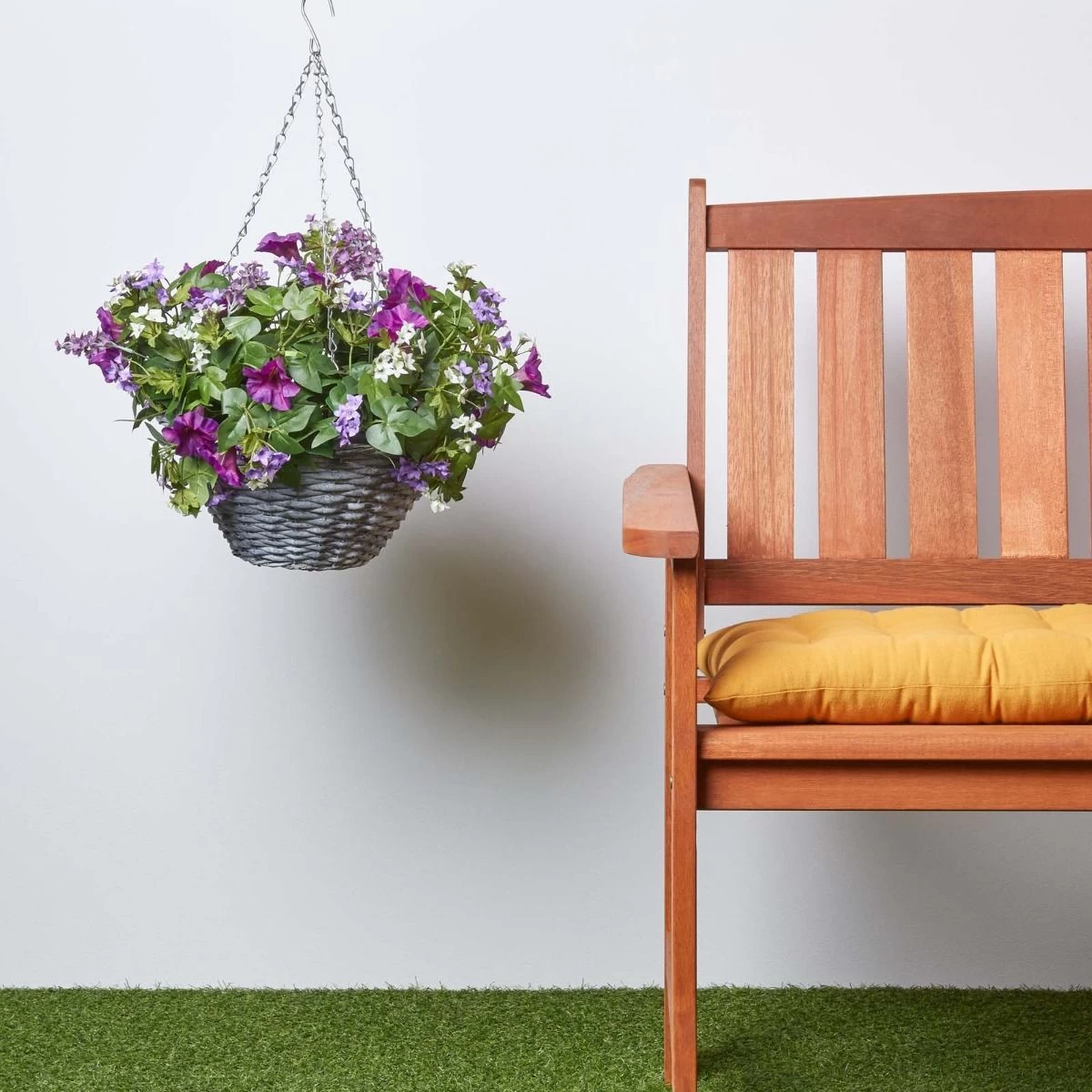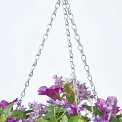 Homescapes is a leading retailer of replica artificial hanging baskets , trees and artificial potted plants. Each stem, leaf and petal has been carefully handcrafted from a silk-like polyester by skilled experts to ensure that it looks realistic and lifelike. This fake hanging basket measures approximately 58 cm from the top of the chain to the bottom of the basket. No need for watering or constant maintenance, petals have been UV protected to prevent colour fade.