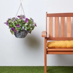 Bright and colourful purple and white petunia hanging basket potted in a brown wicker basket. Perfect for adding a splash of colour and floral feel to your indoor or outdoor décor, they can be displayed on shaded patio and decking area as well as throughout your home, creating an indoor tropical style.