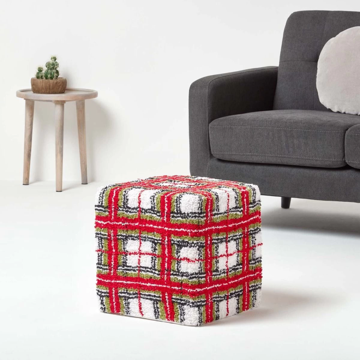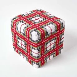 Homescapes cube pouffe, footstool, coffee or side table, upholstered in tufted cotton with the traditional red and white Scottish Tartan pattern.