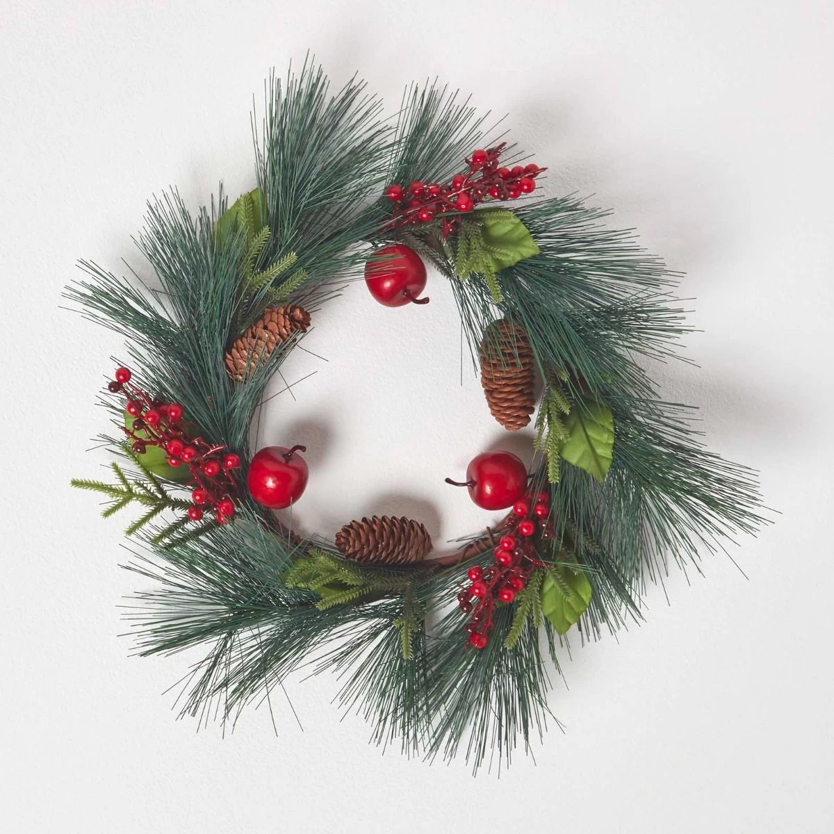 Traditional Christmas wreath, decorative green and red wreath with faux foliage and red apples and berries, versatile Christmas door wreath for indoor and outdoor use.