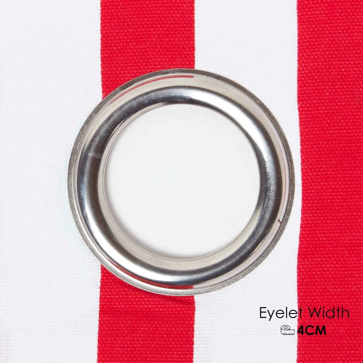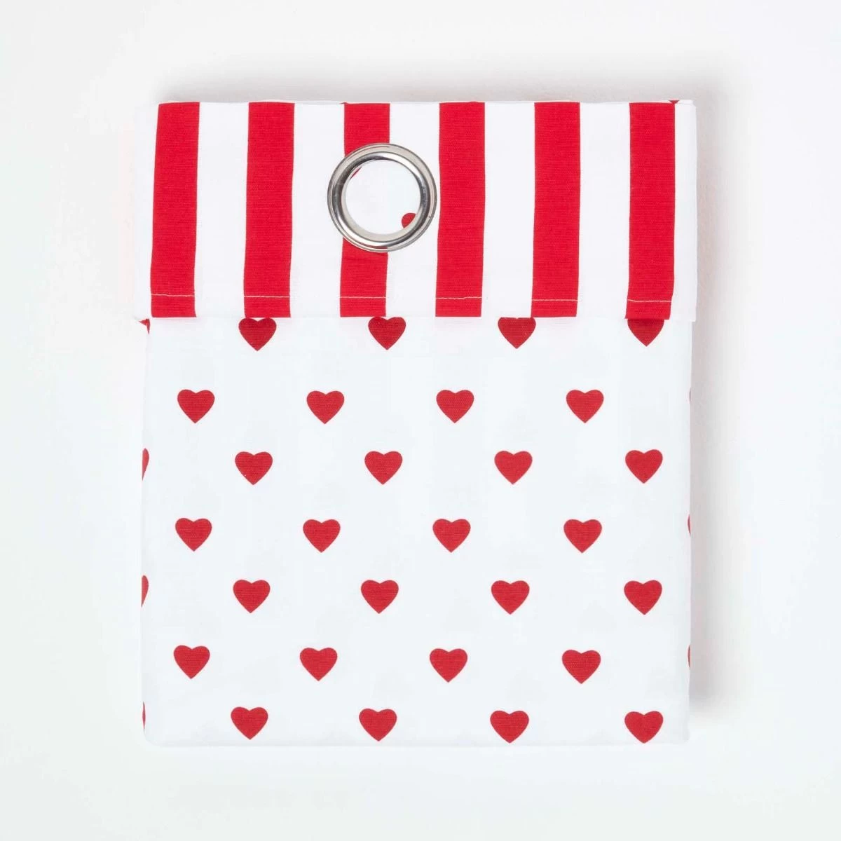 These delightful Red Love Hearts Eyelet Curtains will fit perfectly in any room with a modern decor. The bold red stripes and hearts contrast wonderfully with the white background. These charming Red Heart Curtains are one pair in Homescapes impressive range of pure cotton designer curtains in many charming designs and soft prints. Our modern ring top or eyelet curtains are made with heavy cotton fabric and a wide range of colours, which allows our curtains to coordinate well with almost any interior setting and the vivid colours used are able to uplift the mood of any room. These curtains are suitable for all spaces, and would fit perfectly in rooms with both modern and tradition decors due to their versatile print. Please note, these curtains are not lined and so they will have to be used in conjunction with a black out curtains in order to make them light proof.