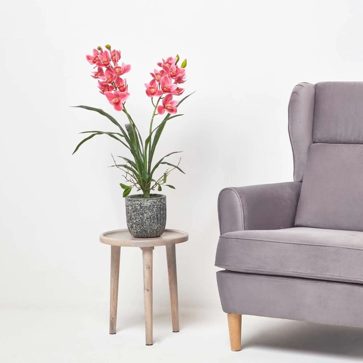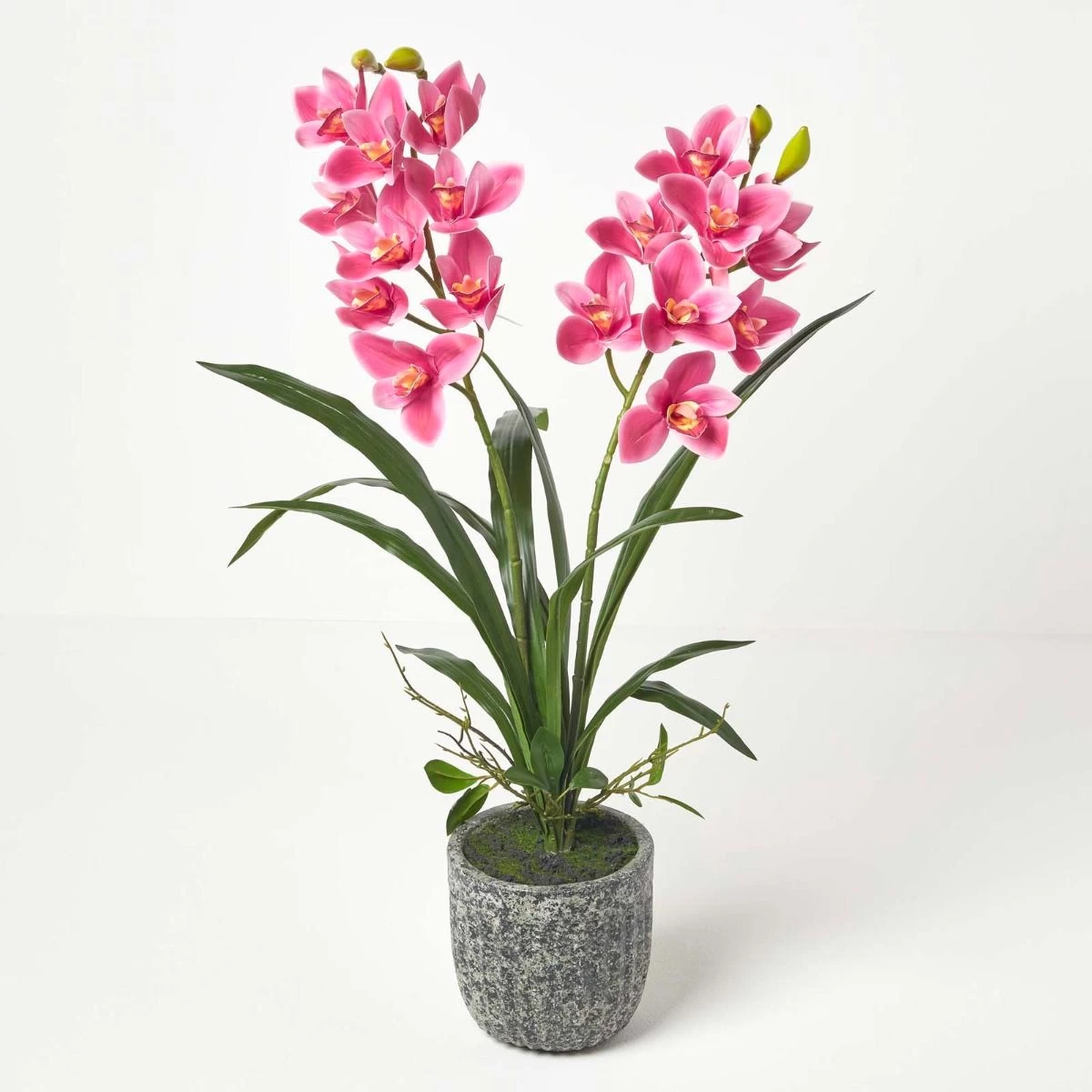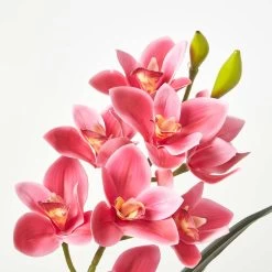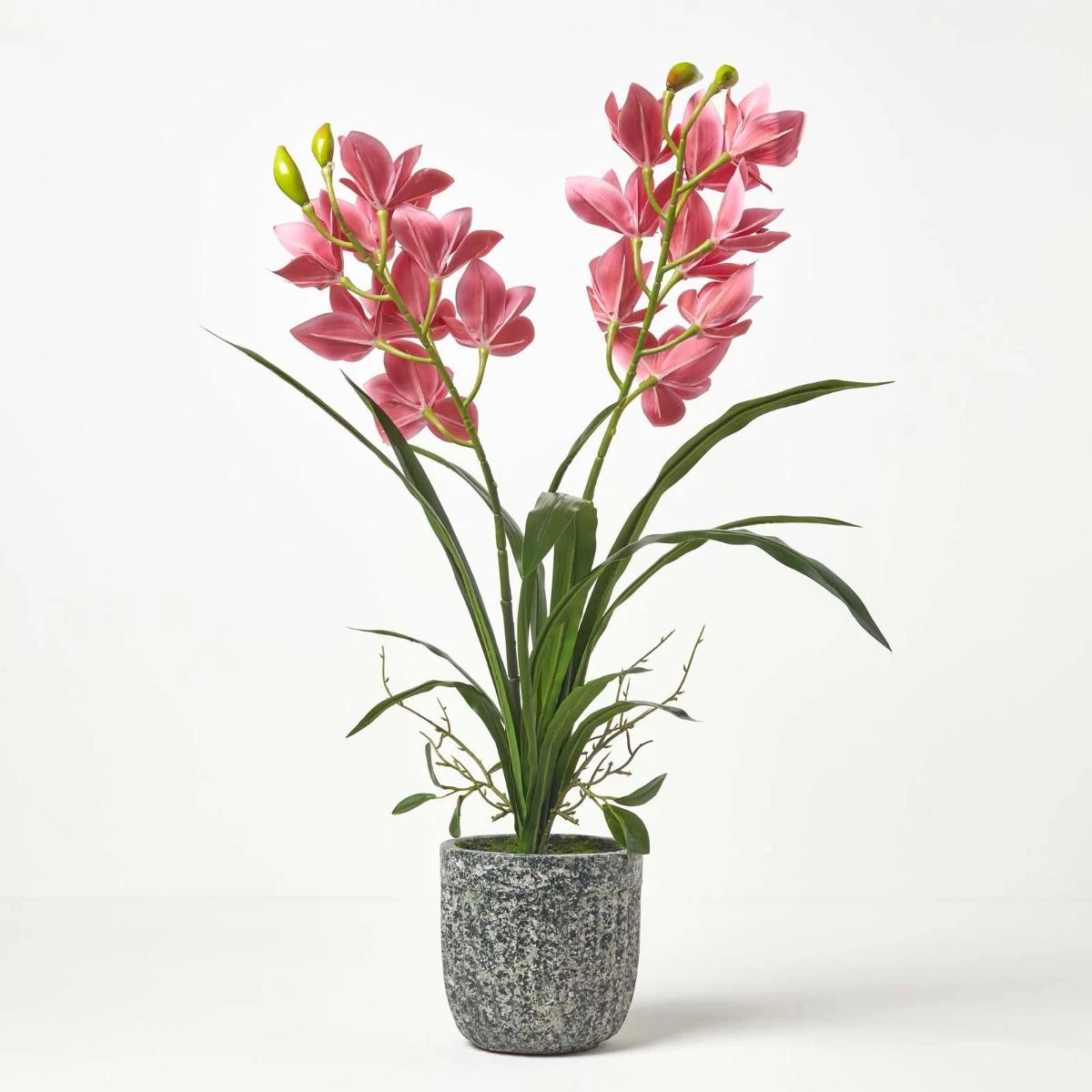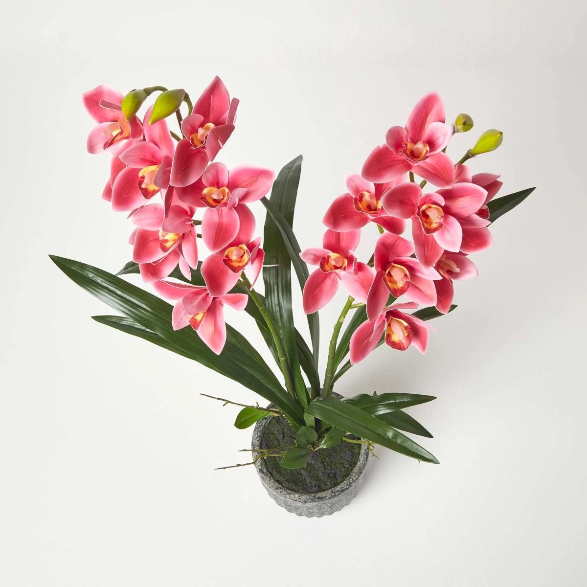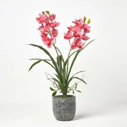 Stunning red Cymbidium large artificial orchids in pot from Homescapes in a decorative dark cement pot, ideal for adding style and colour to contemporary interiors.