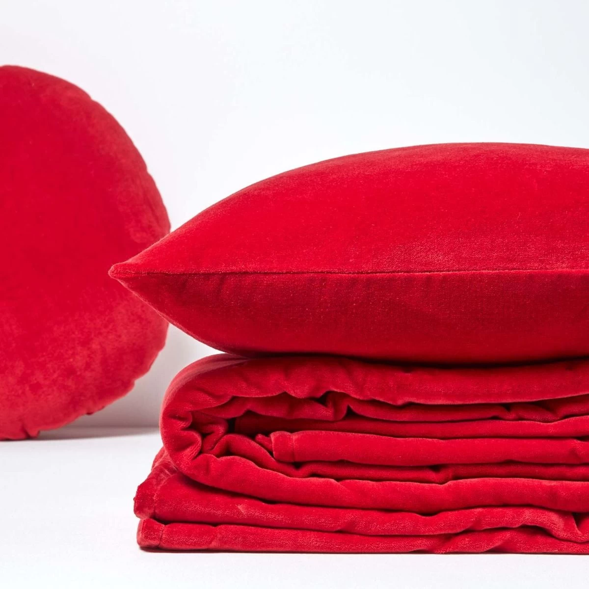 Red throw woven from 100% cotton velvet, finished with handstitched embroidery and quilting. This luxuriously soft velvet throw is available in two large sizes.
