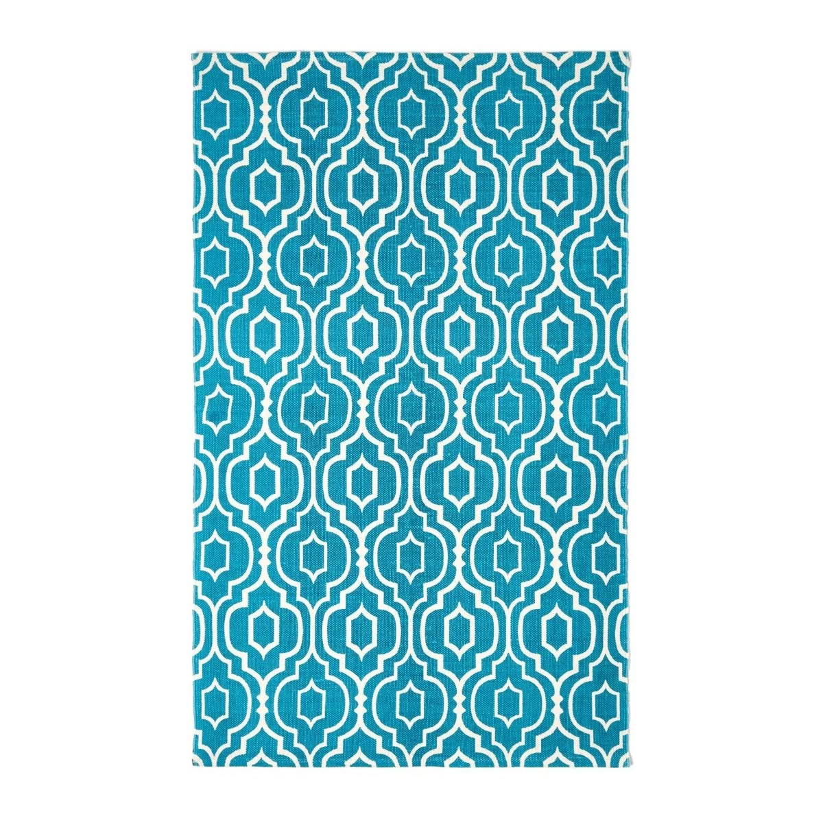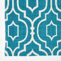 Add a splash of colour to white or neutral interiors with this teal rug from Homescapes. Riga features a contemporary geometric style design on a teal blue base. This rug works particularly well on wooden floors in your bedroom, living room or dining room.