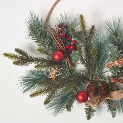A colourful Christmas wreath that will introduce a contemporary twist to your home this winter, this on-trend decorative wreath is light weight and easy to hang. Featuring a large Christmas swag of deep green artificial fir branches, colourful red berries and baubles it’s an on-trend modern take on traditional Christmas colours.