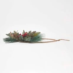 A stylish Christmas wreath for indoor and front door decoration. This contemporary Xmas wreath features a large twine-wrapped metal ring and decorative Christmas foliage and pinecones.