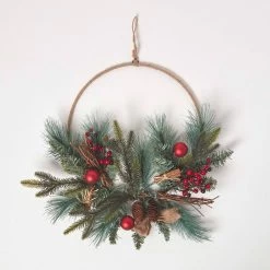 A colourful Christmas wreath that will introduce a contemporary twist to your home this winter, this on-trend decorative wreath is light weight and easy to hang. Featuring a large Christmas swag of deep green artificial fir branches, colourful red berries and baubles it’s an on-trend modern take on traditional Christmas colours.