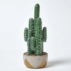 Add a stylish touch to your bedroom, living room or office with this artificial Saguaro cactus from Homescapes. Making a statement, this faux plant is 51 cm in height, and is a replica of the classic Saguaro cactus with long arms and white spines. To add even more style to your interiors, it comes inside a decorative geometric pot that features a metallic triangular pattern.