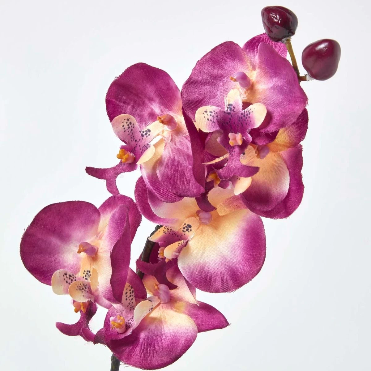 From our expansive range of artificial plants, these fake orchids in striking burgundy and cream are sure to catch the eye of everyone in the room and are ideal to be placed in any living space.