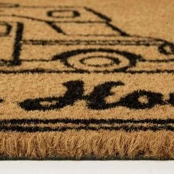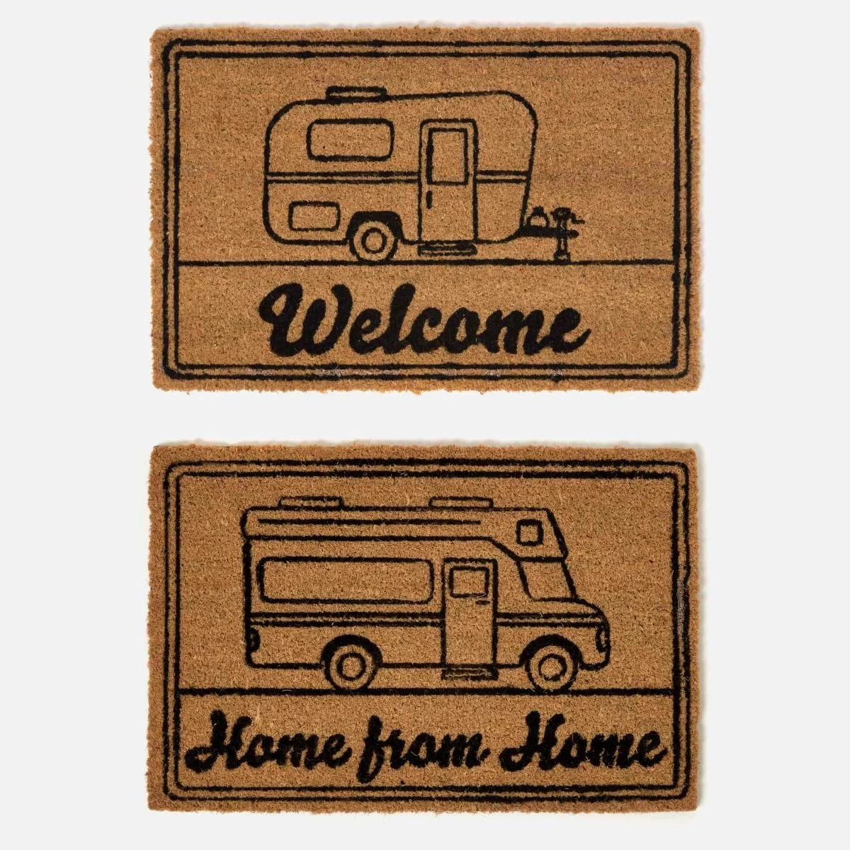 Set of 2 caravan style doormats, heavy duty coir door mats with rubber backing, featuring caravan cartoons and welcome messages that are suitable for indoor and outdoors.