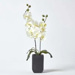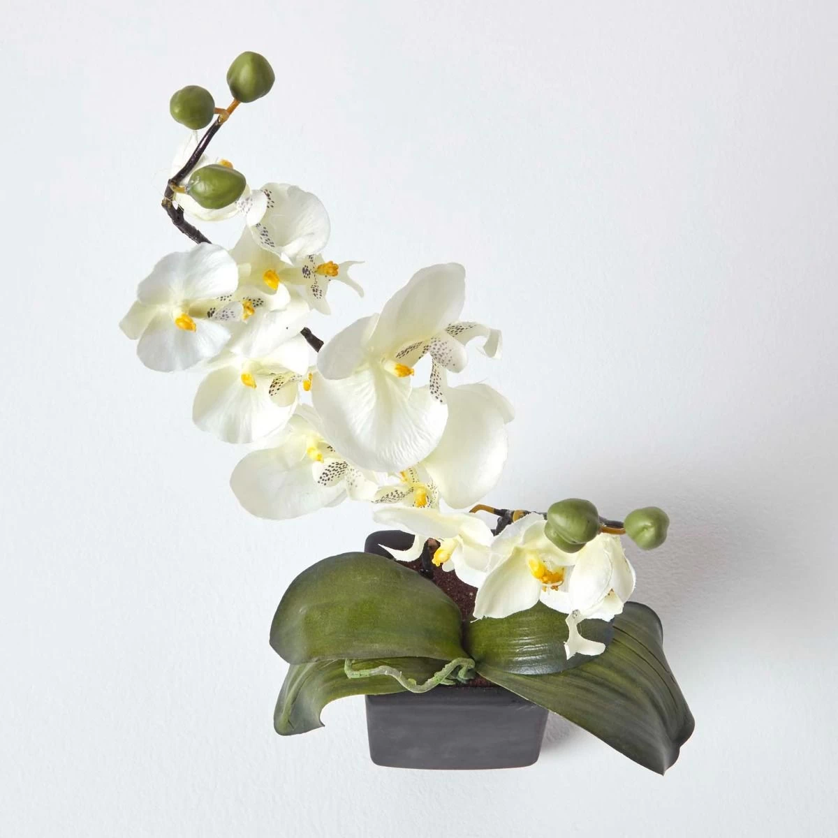 Artificial orchids in classic cream from Homescapes that come in their own stylish black ceramic pot, to add some floral decoration to your home interior.