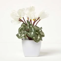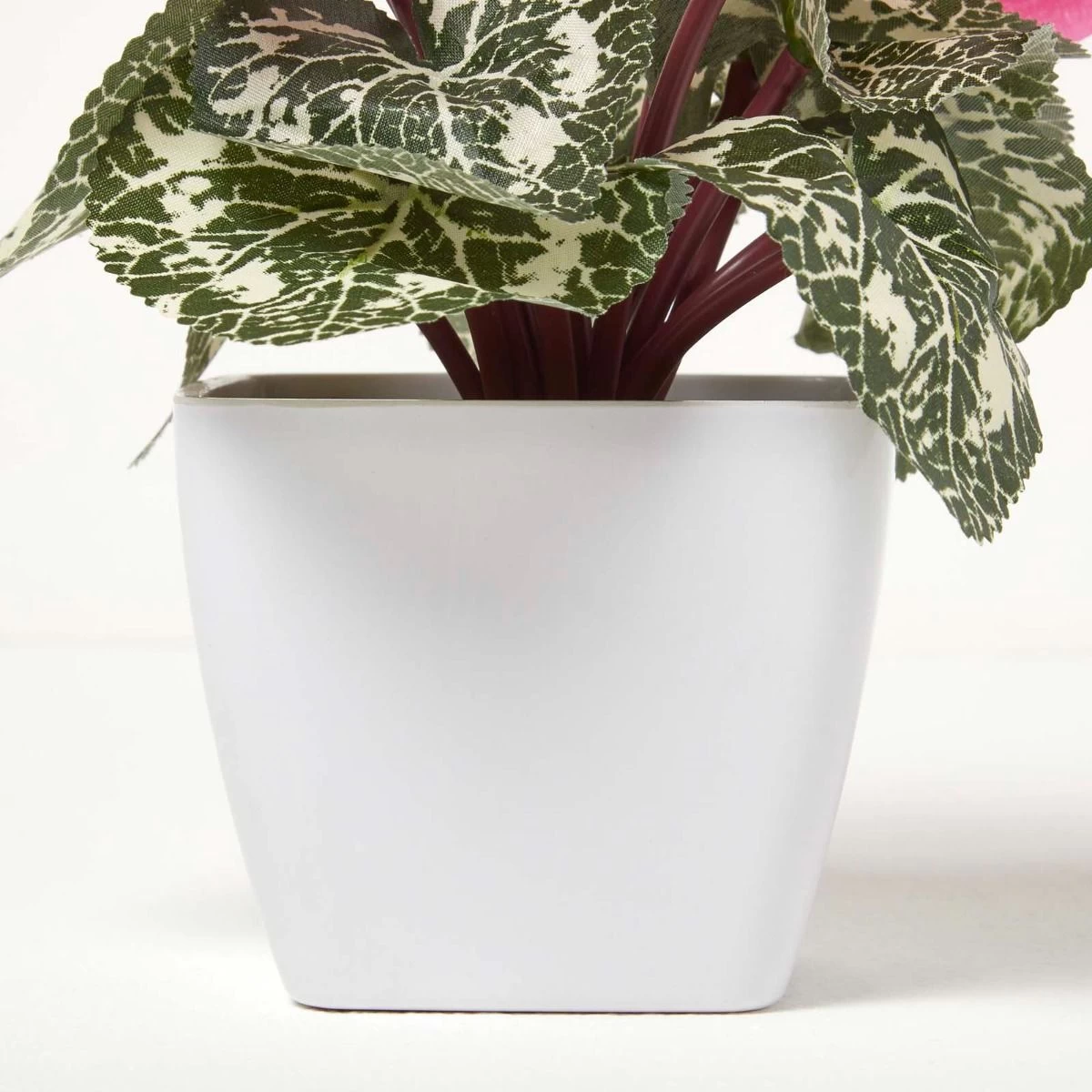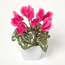 Show your devotion with this potted Cyclamen. Made from silk-like material, this faux Cyclamen will never wane or wither. Includes a classic white pot.