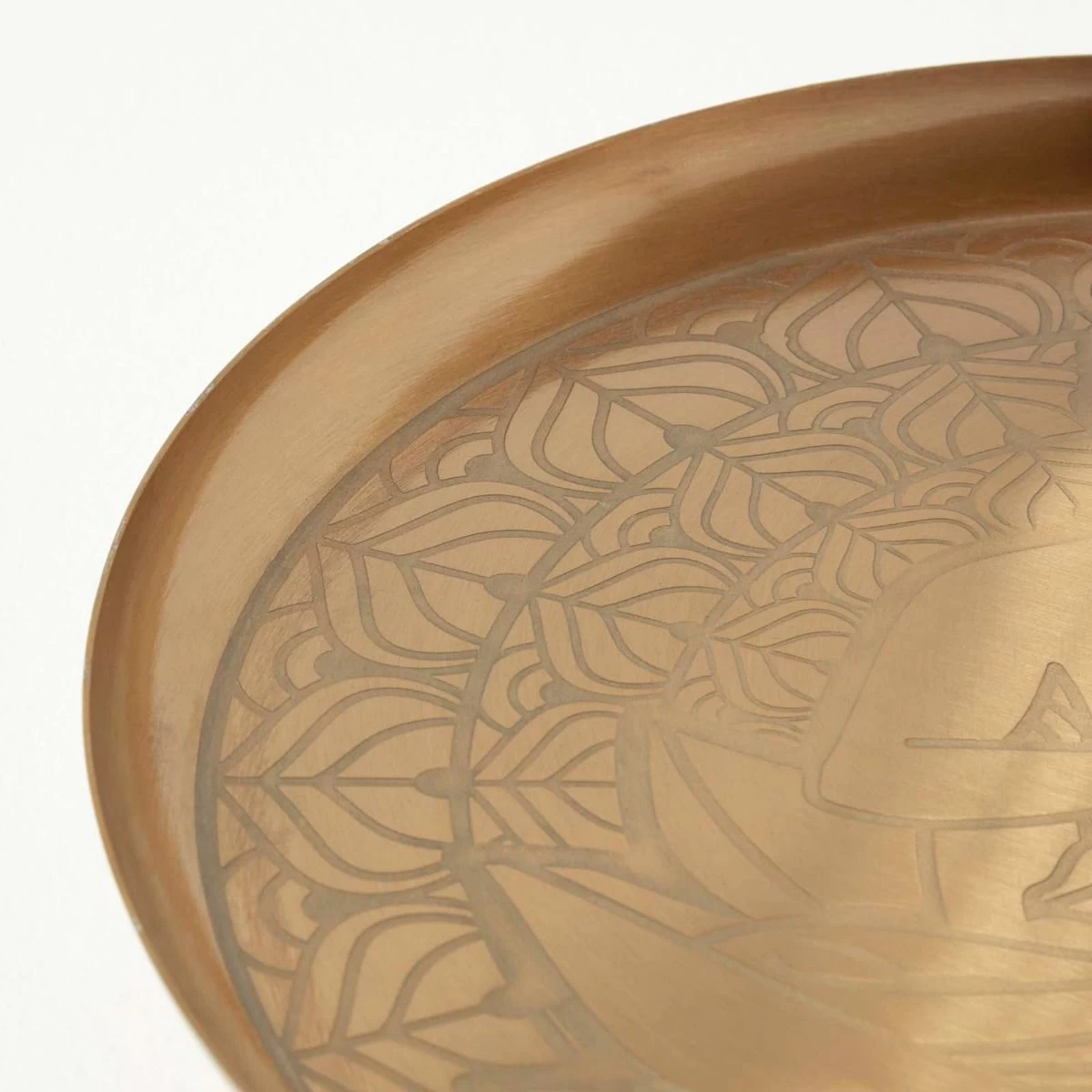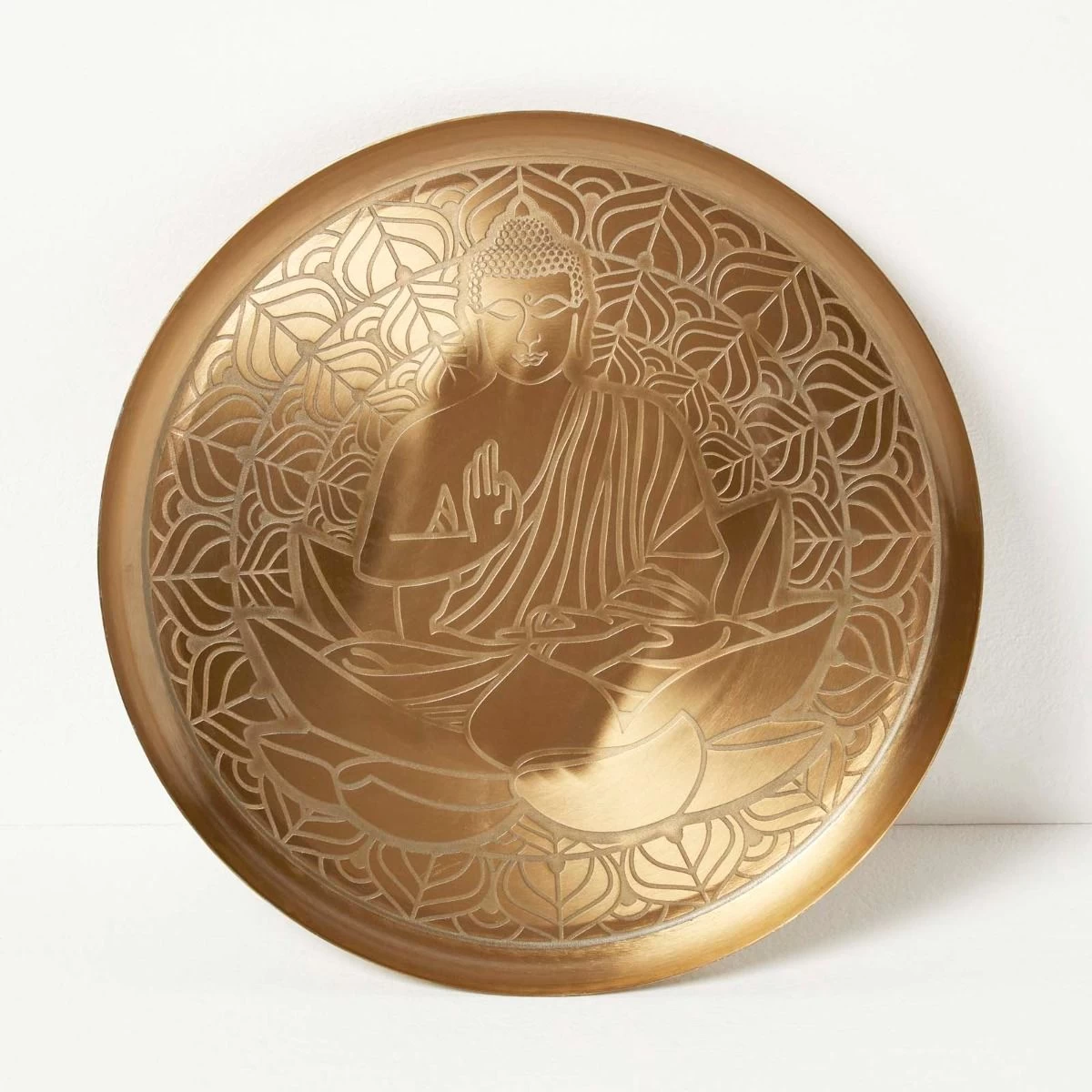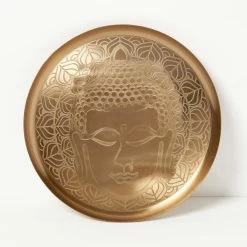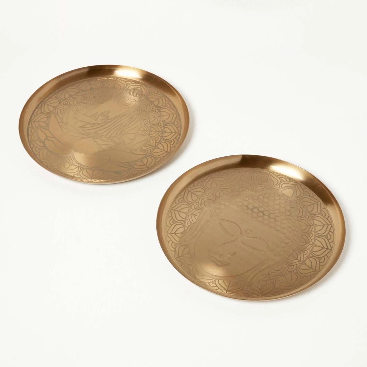 Set of 2 decorative gold trays with Buddha design, these carefully engraved trays feature 2 complementing designs, one of a meditating Buddha and another with the head of a Buddha. Measuring 33.5 cm wide, they are ideal for displaying candles and tea lights, ornaments and small plants.