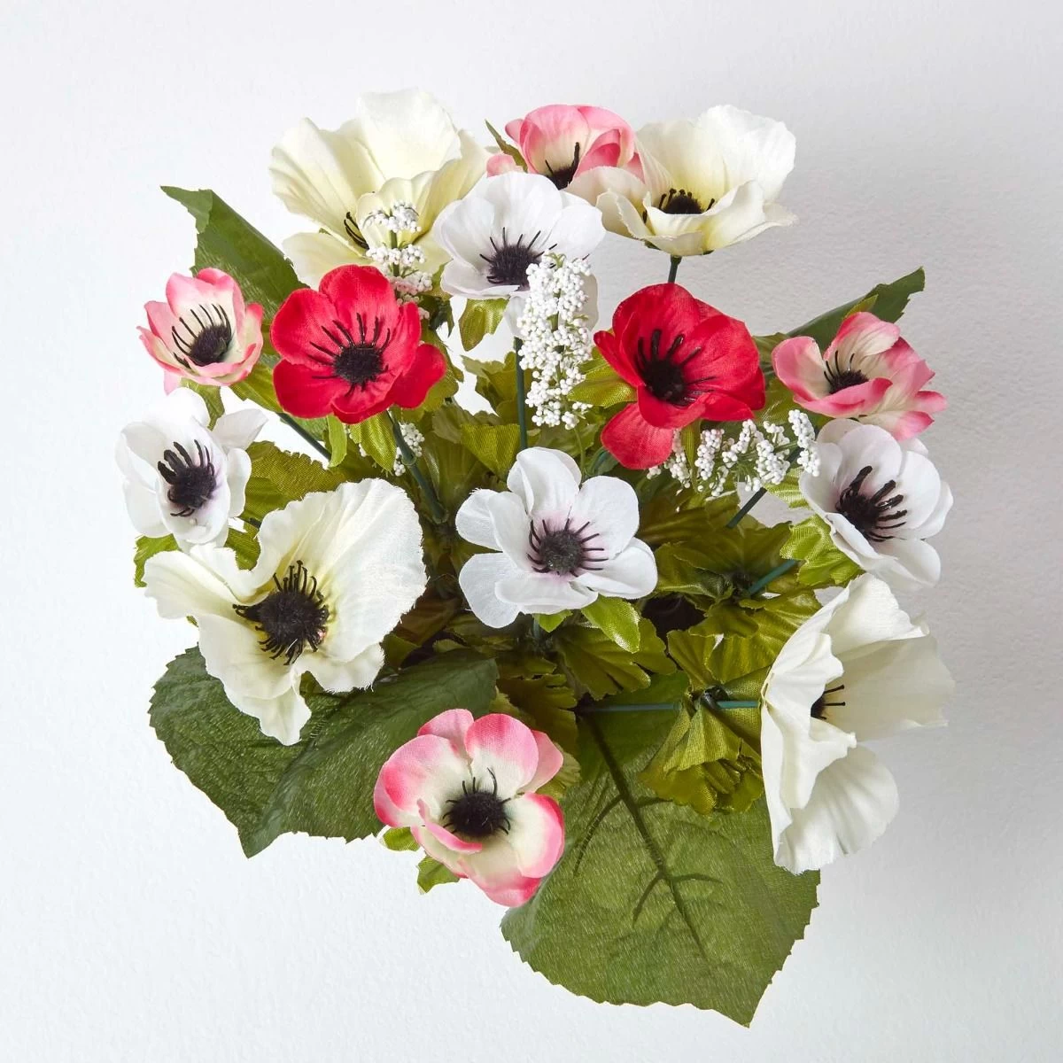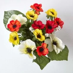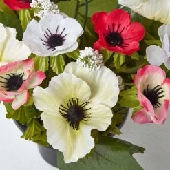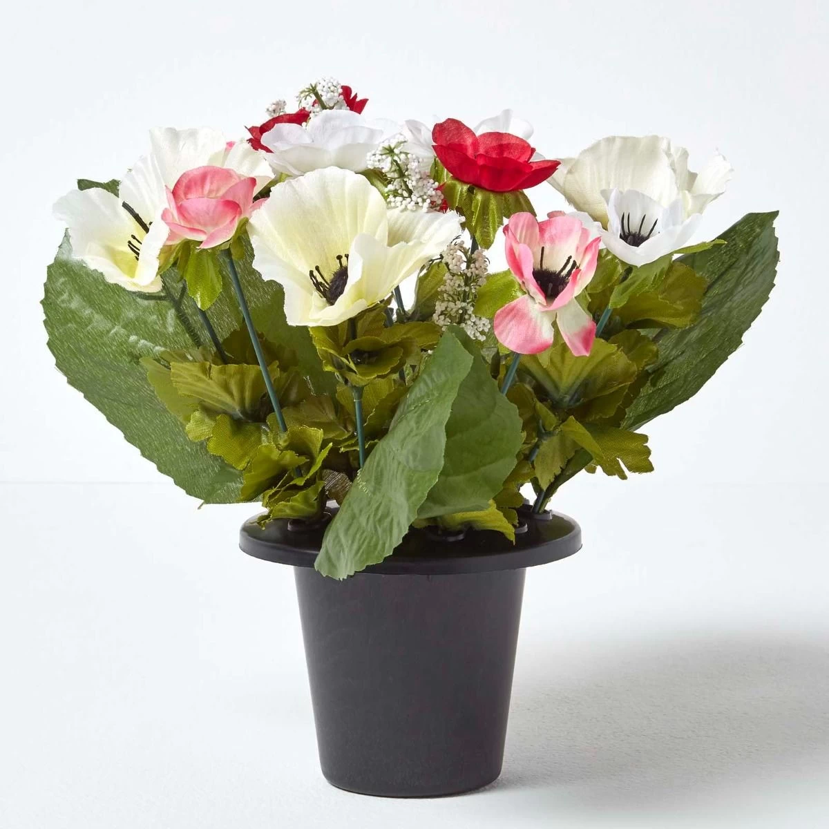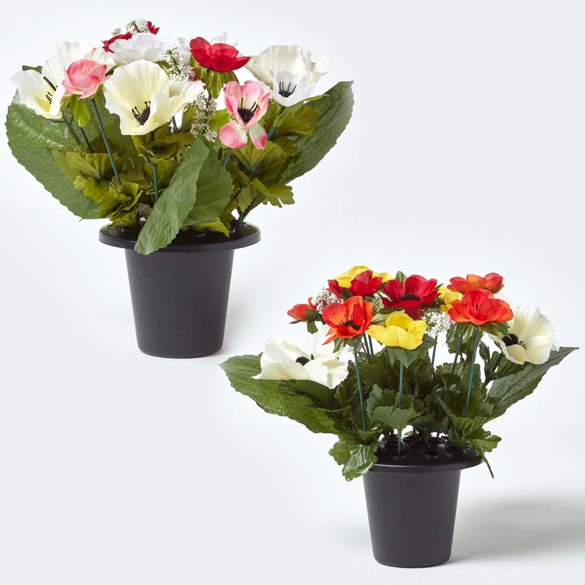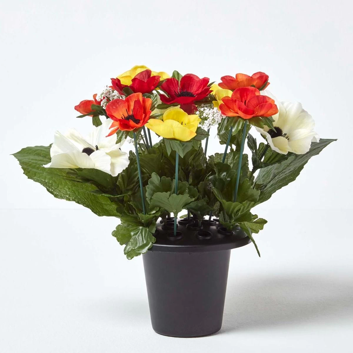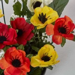 Lifelike artificial flower arrangement in grave vase with multi-coloured anemone flowers and green foliage, perfect for decorating your loved one’s memorial.