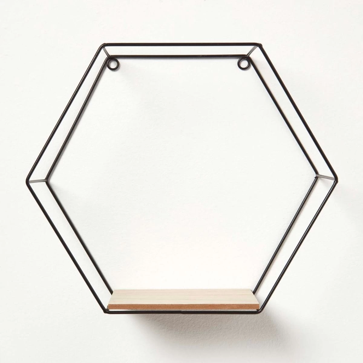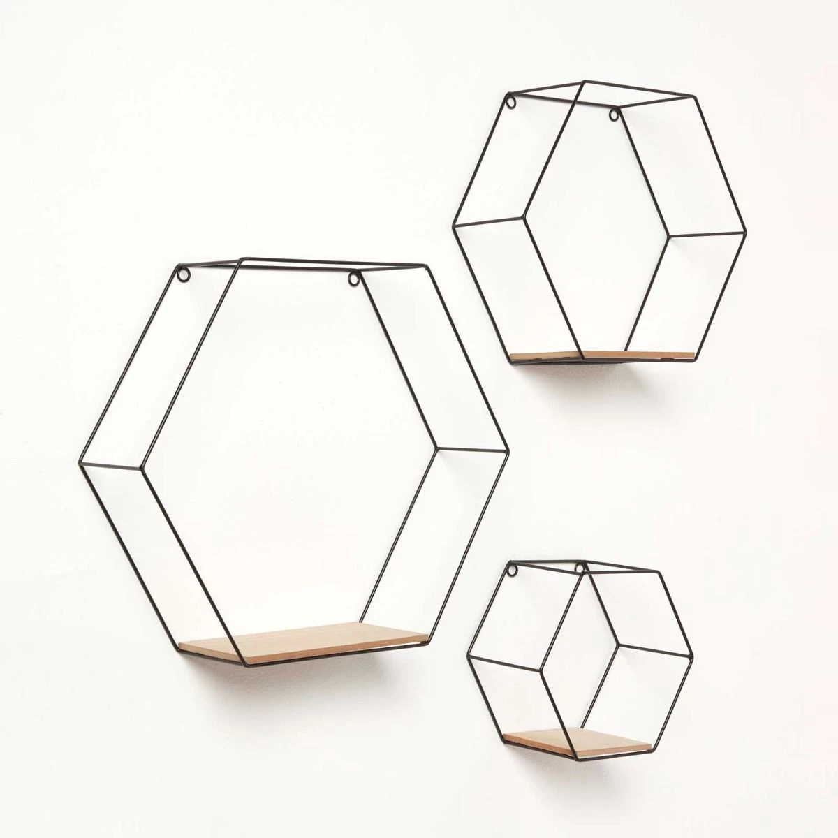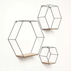 Set of 3 hexagon shaped black metal and wood floating shelves, easy to hang, shabby chic style framed shelves crafted from solid wood.